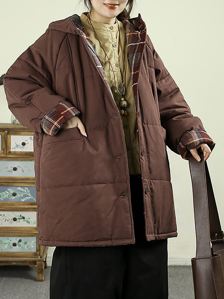 Women Vintage Winter Plaid Hooded Overcoat