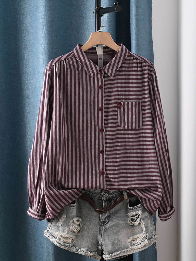 Women Vintage Autumn Stripe Turn-down Collar 100%Cotton Shirt