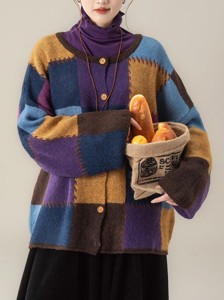 Women Vintage Winter Colorblock Plaid O-Neck Sweater