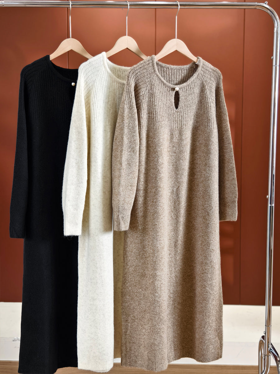 Women Autumn Casual Pure Color O-Neck Knitted Dress