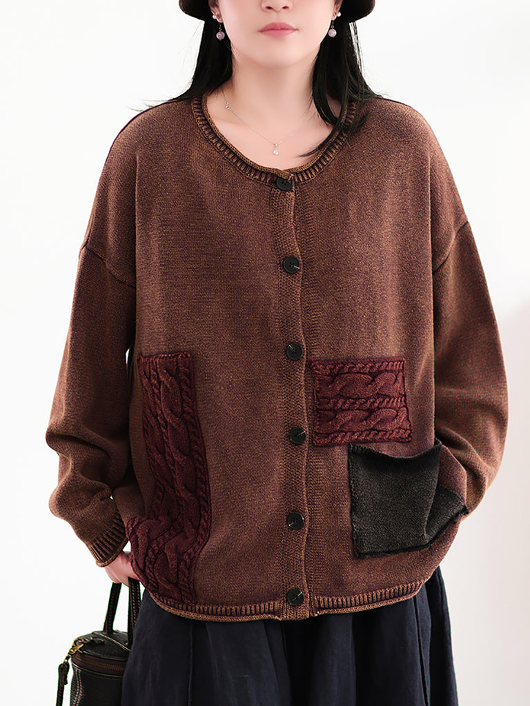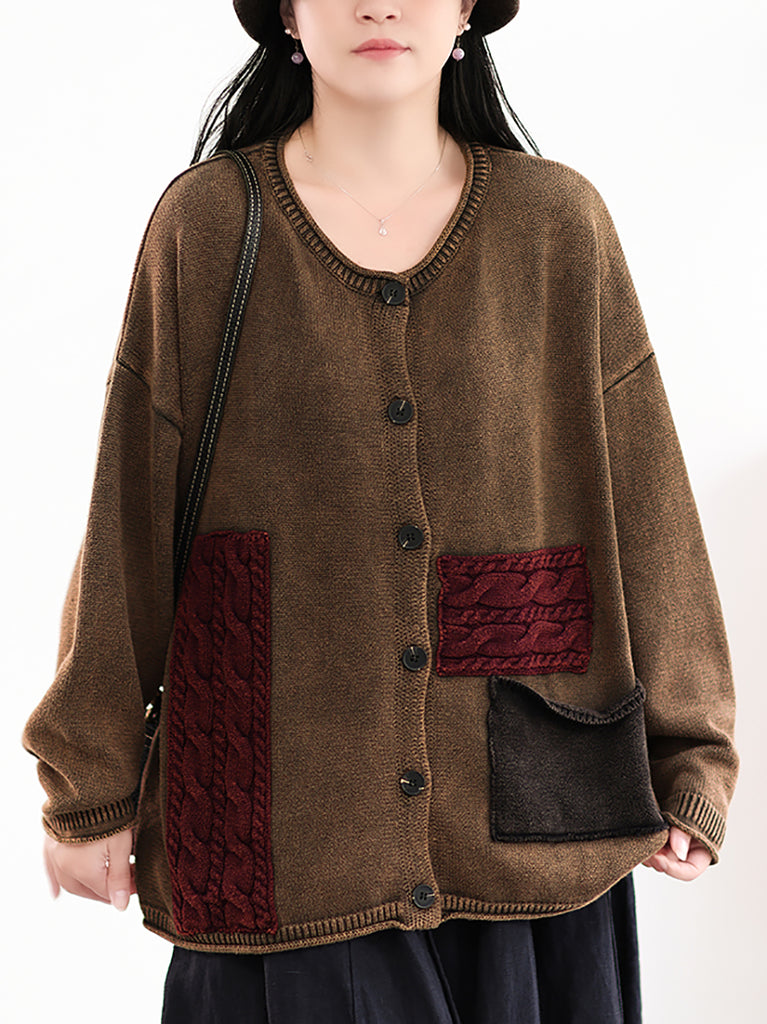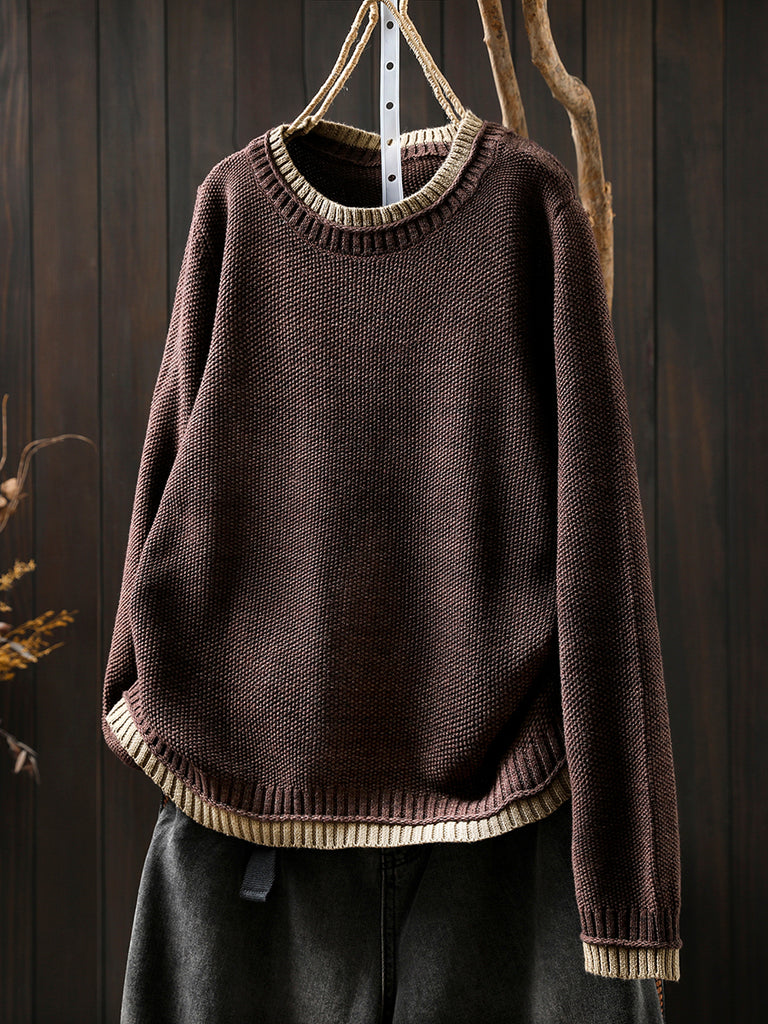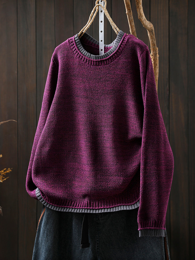 Women Autumn Retro Patch Spliced Knitted O-Neck Sweater