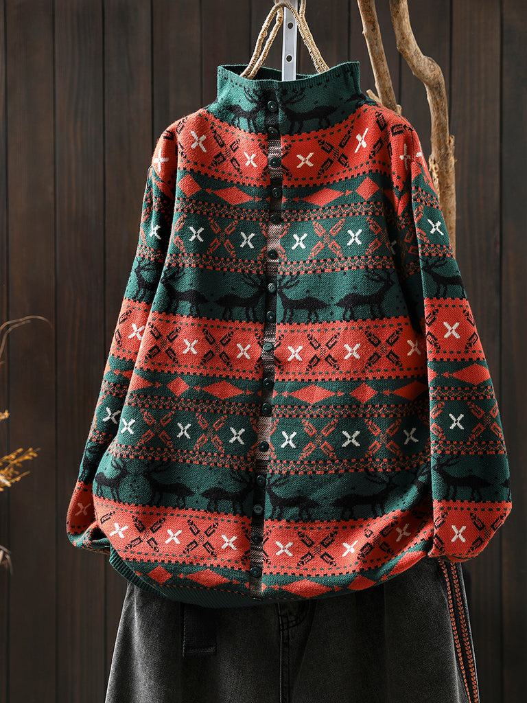 Women Autumn Artsy Deer Stripe Stand Collar Sweater