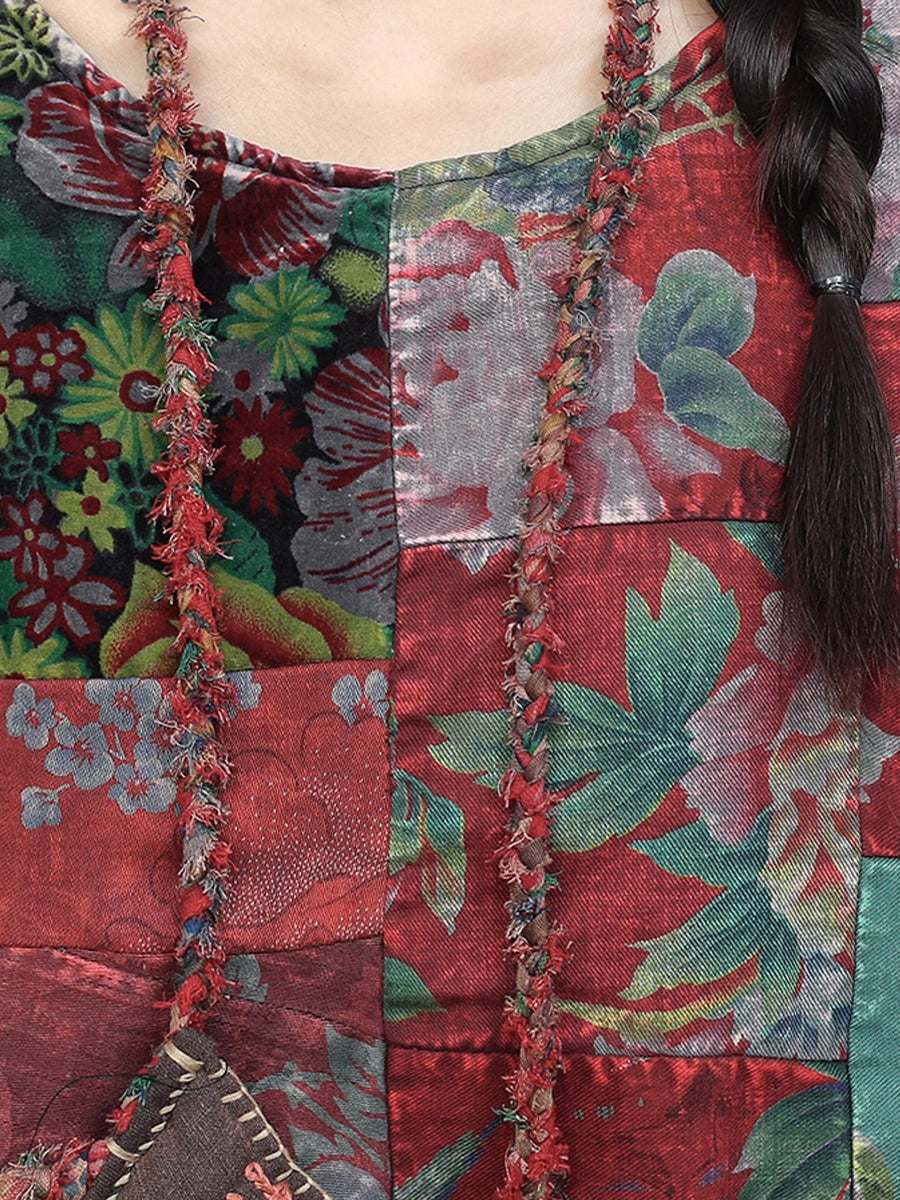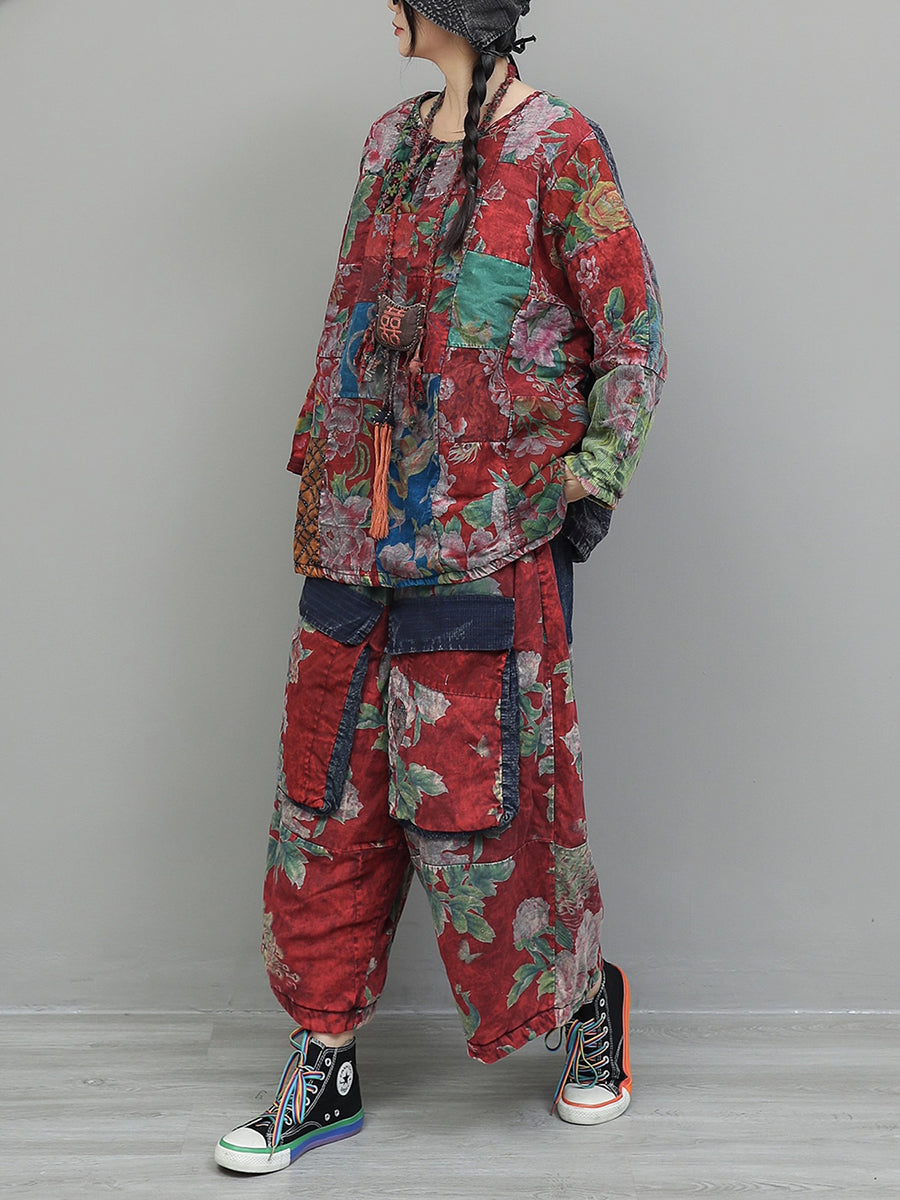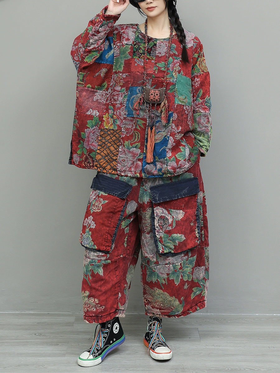 Women Winter Retro Patchwork O-Neck Padded Suits