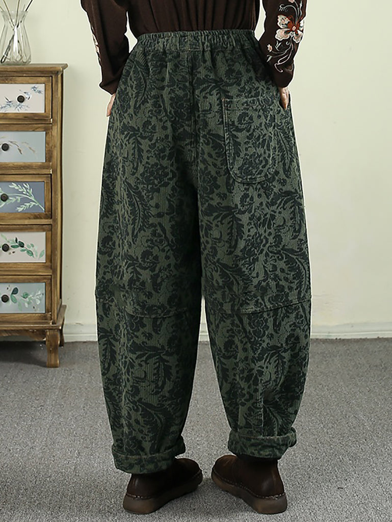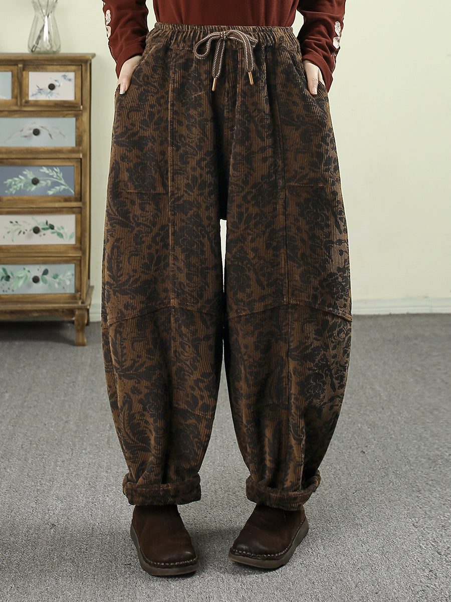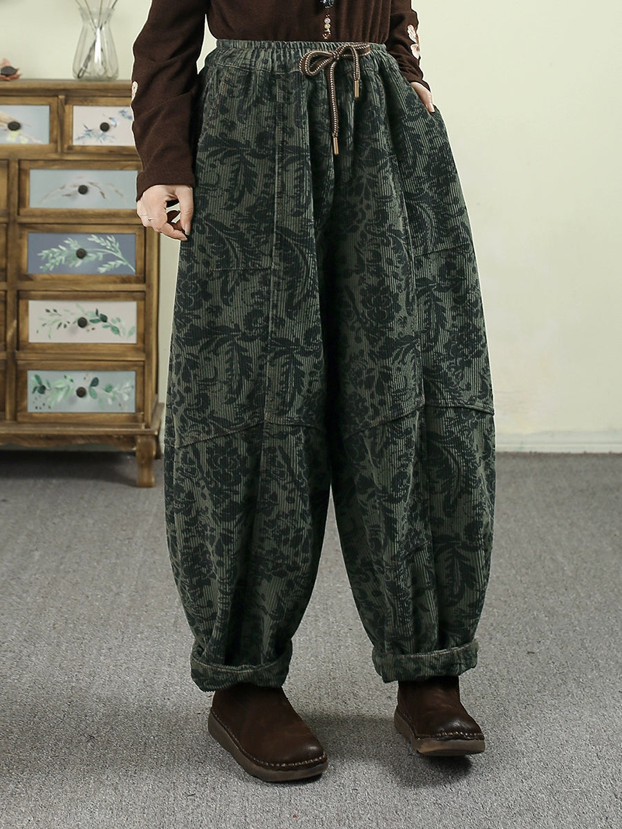 Women Winter Retro Flower Fleece-lined Harem Pants