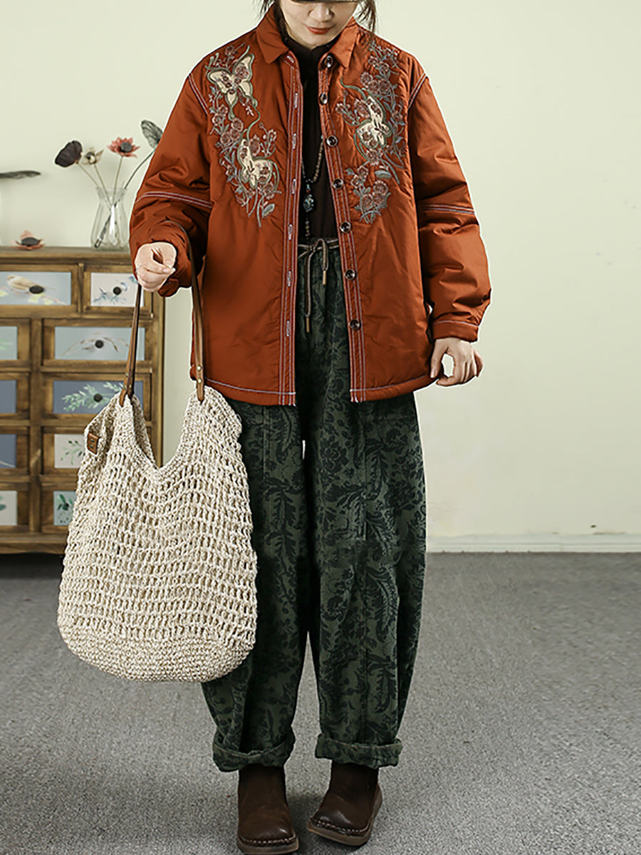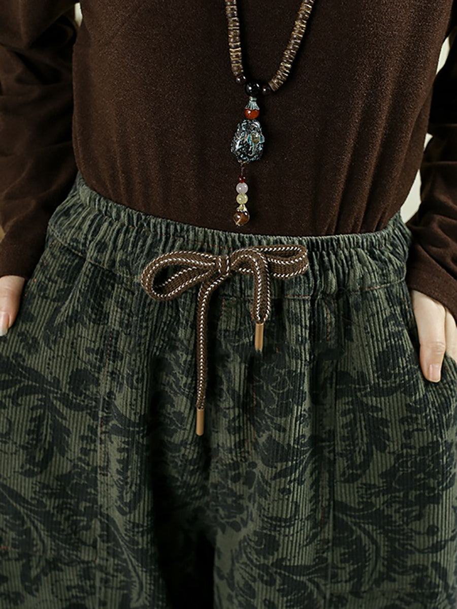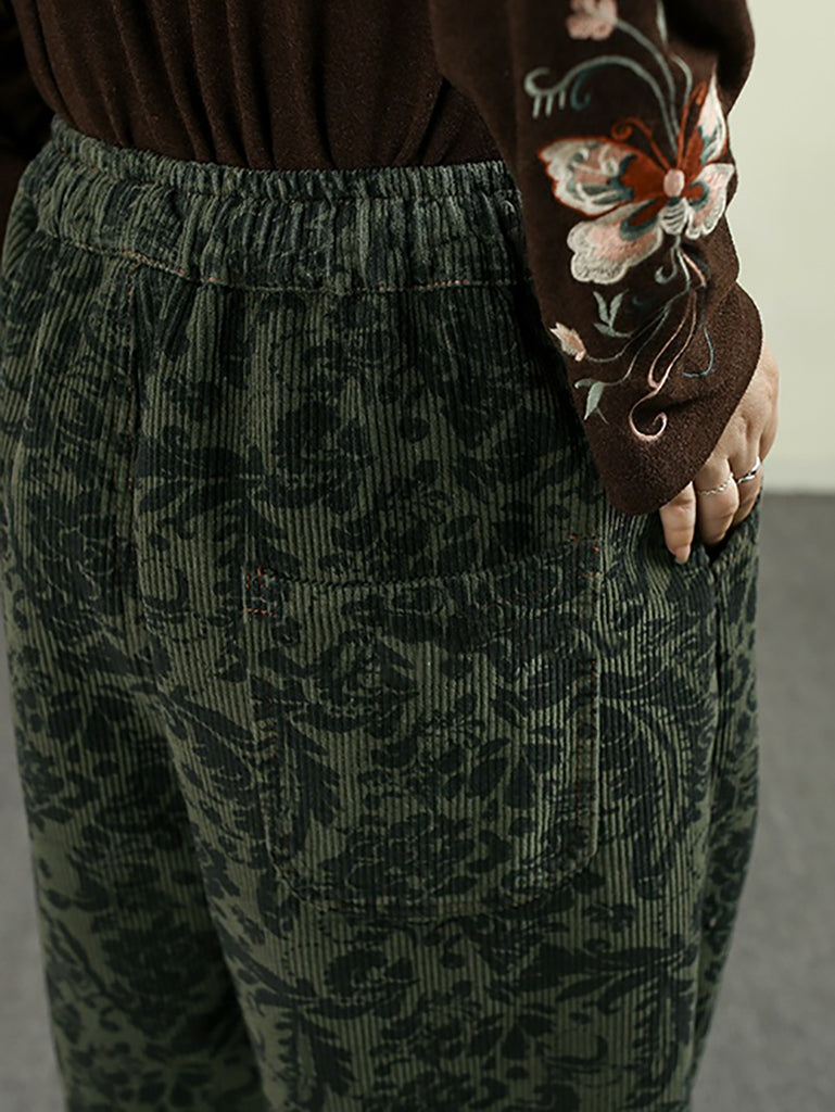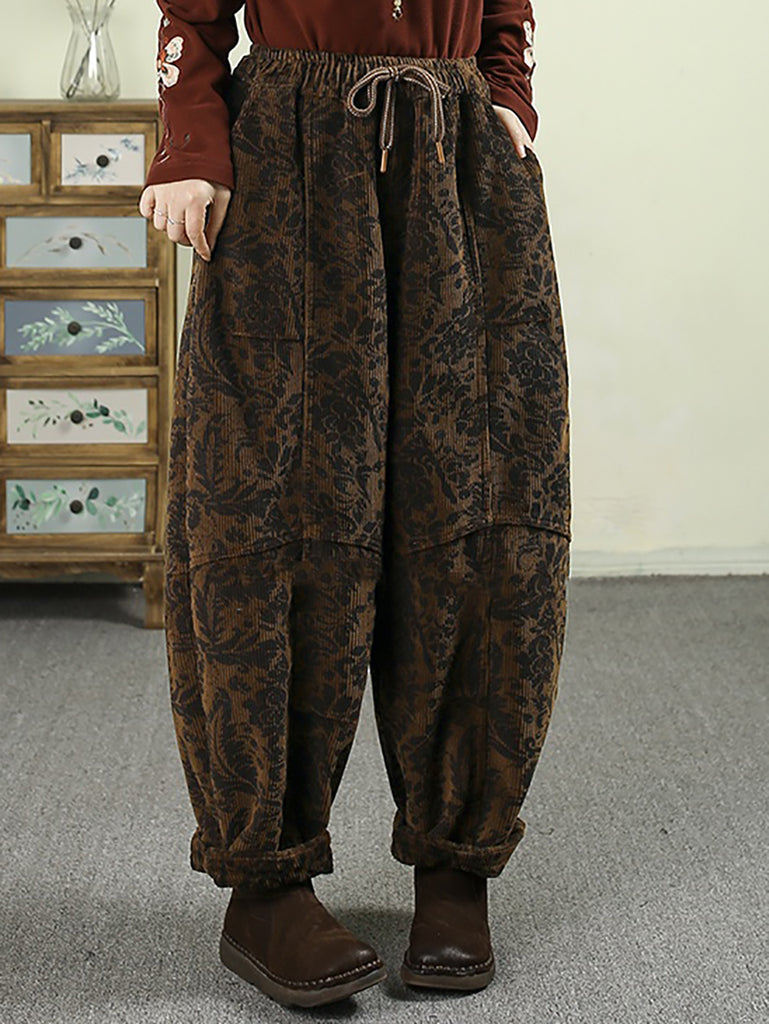 Women Winter Retro Flower Fleece-lined Harem Pants
