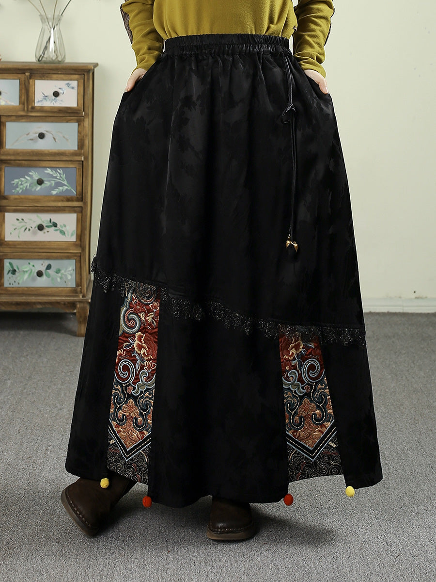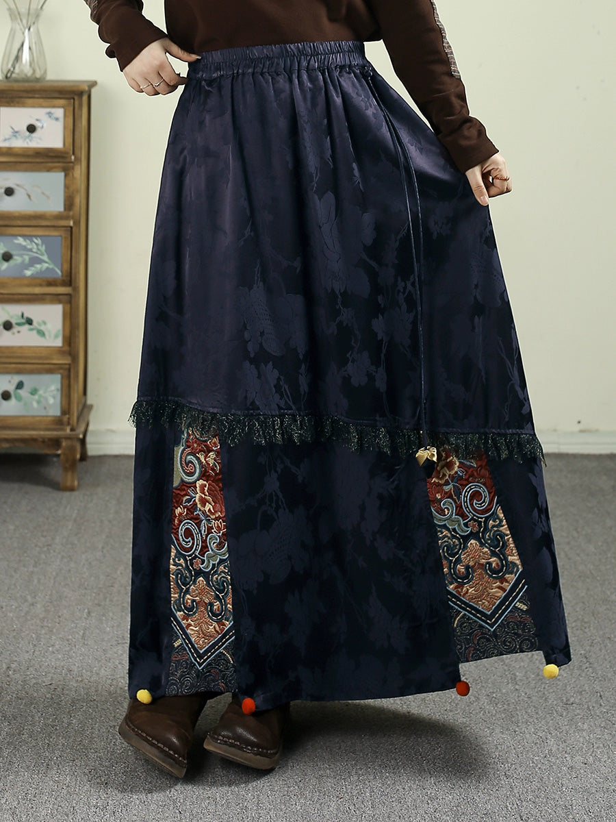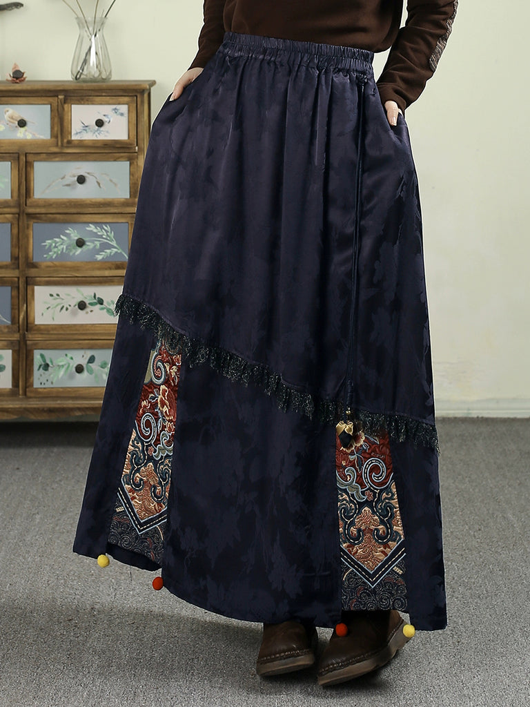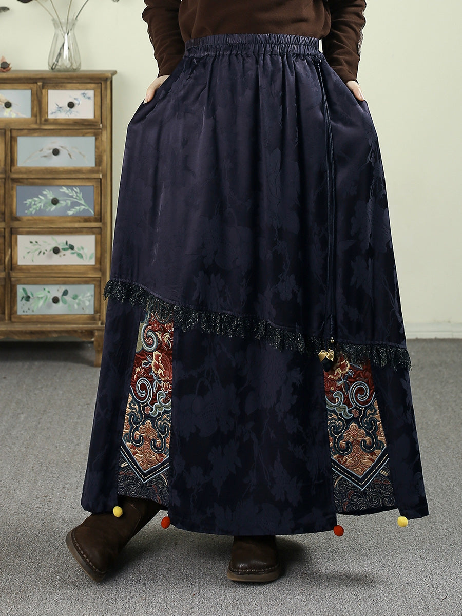 Women Autumn Retro Embroidery Jacquard Tassel A-Shape Skirt