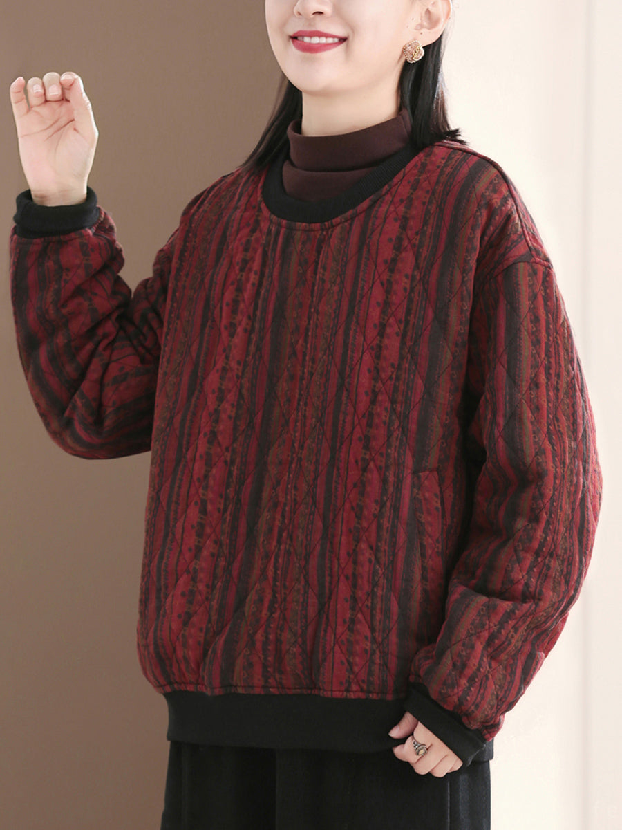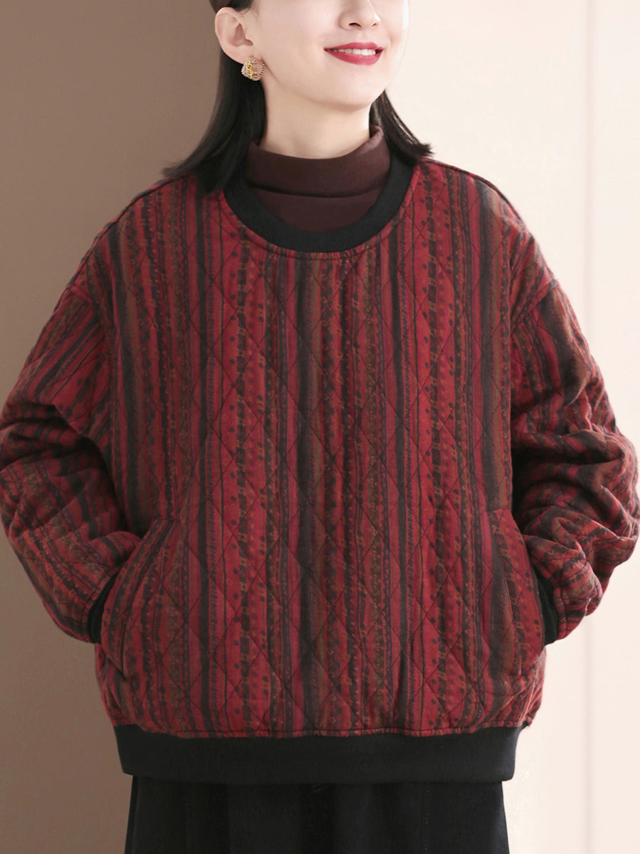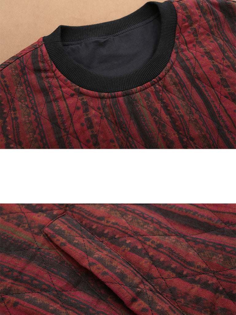 Women Retro Winter Stripe Floral O-Neck Padded Coat