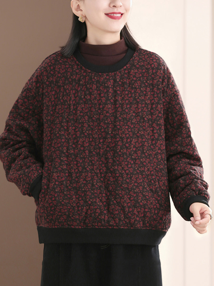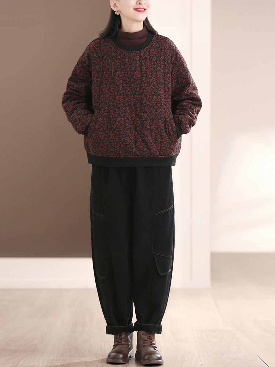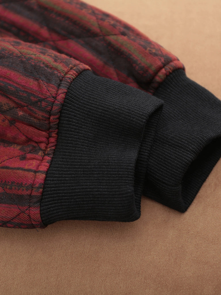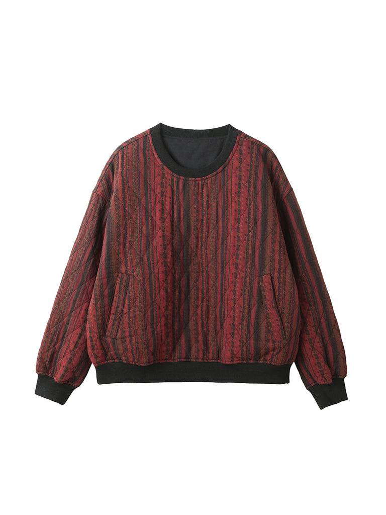 Women Retro Winter Stripe Floral O-Neck Padded Coat
