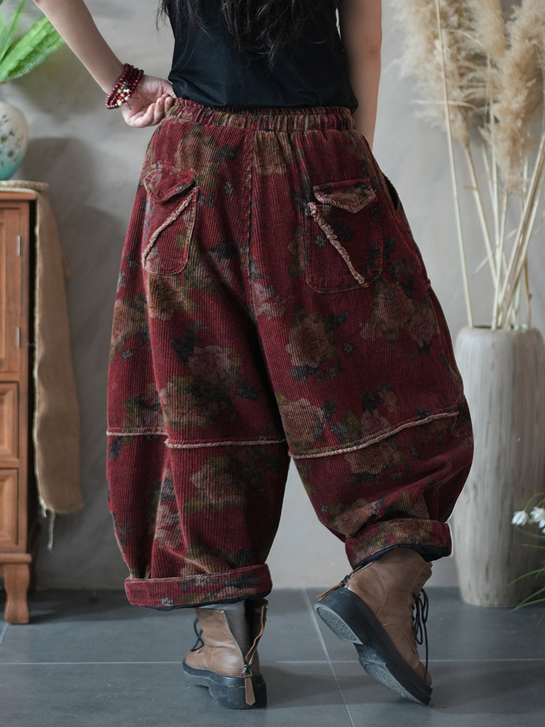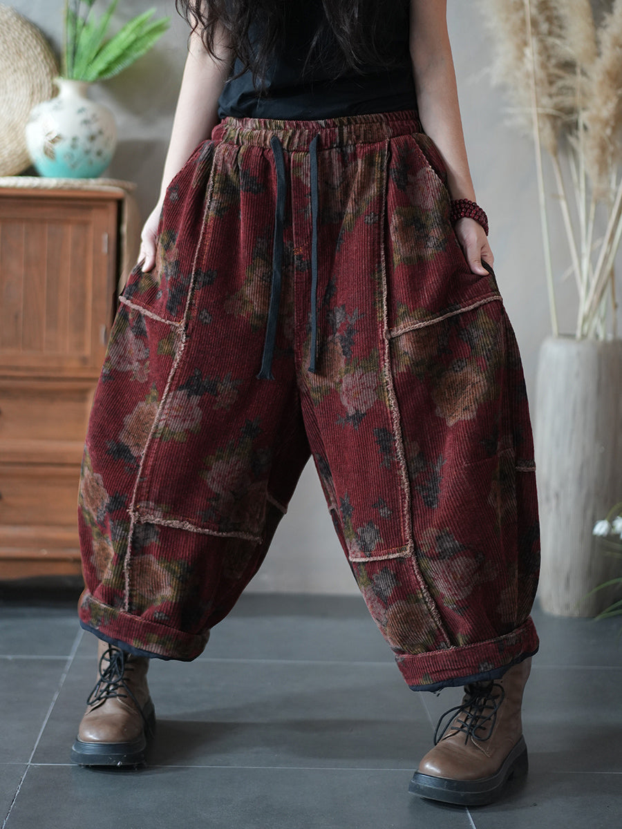 Women Winter Retro Corduroy Flower Spliced Harem Pants
