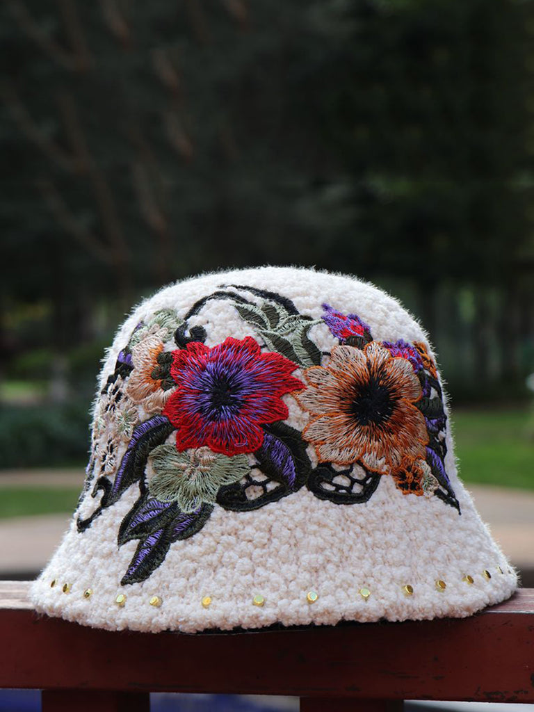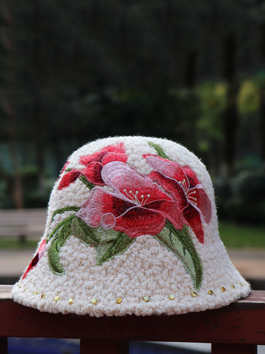 Women Artsy Winter Flower Embroidery Fleece Hat
