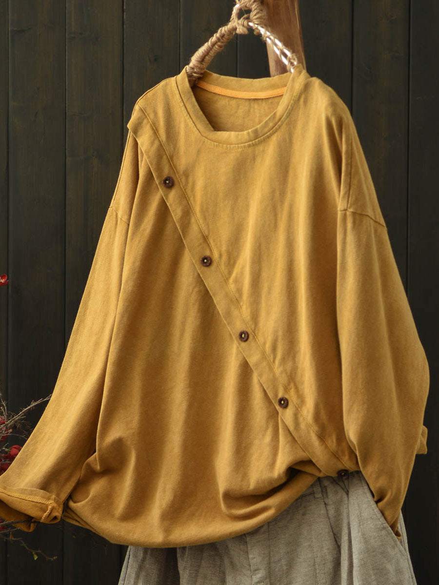 Women Artsy Autumn Slanted Button O-Neck Cotton Blouse