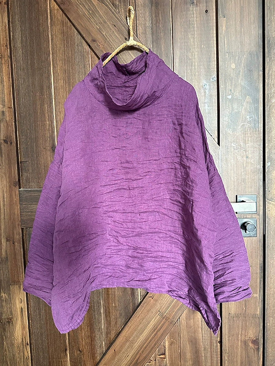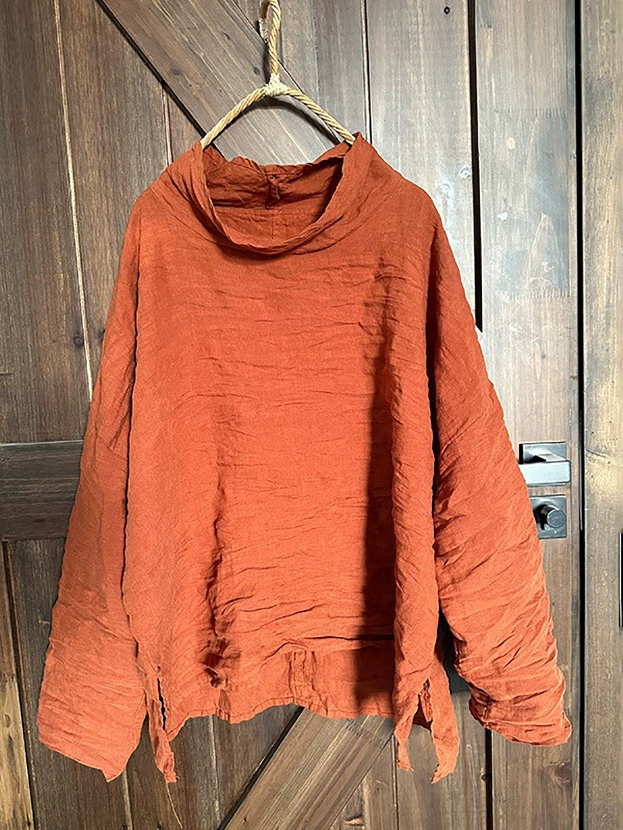 Women Retro Spring Pure Color Linen Turtleneck Blouse