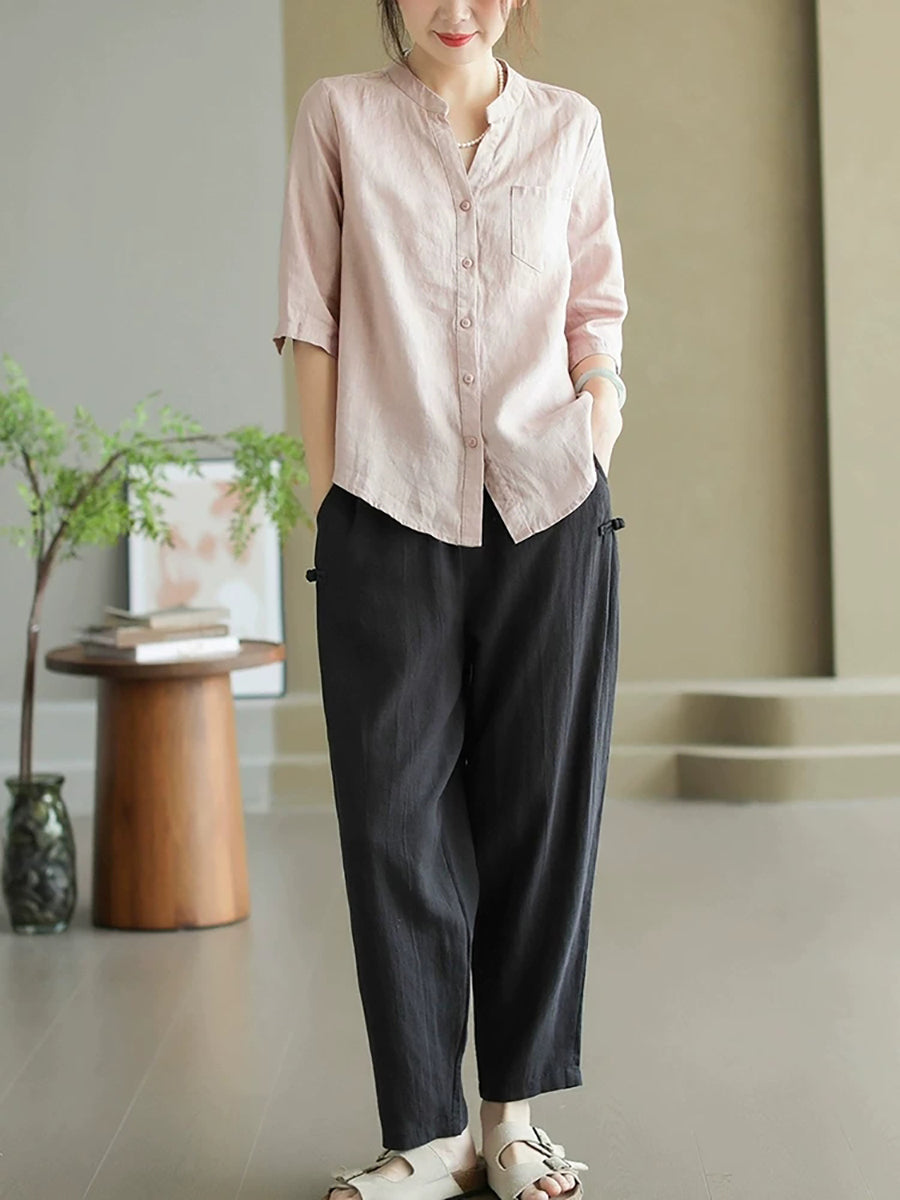 Women Summer Pure Color V-Neck 100%Linen Shirt