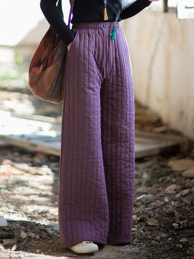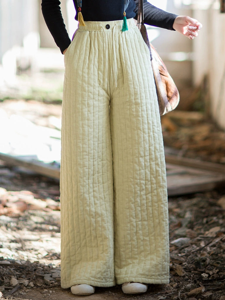Women Winter Vintage Pure Color Ramie Padded Straight Pants