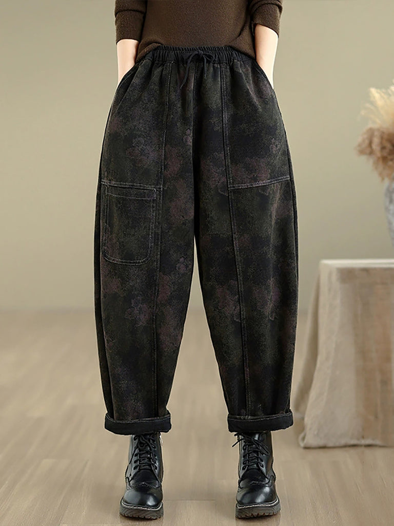 Women Autumn Retro Denim Fleece-lined Harem Pants