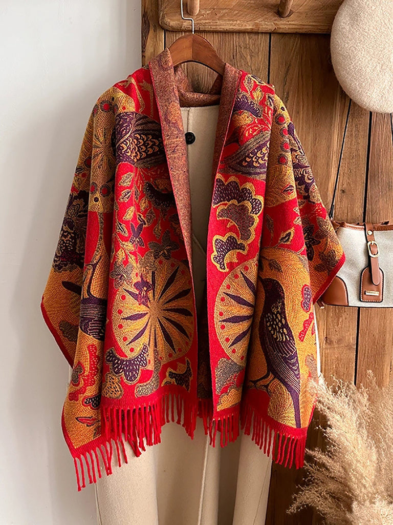 Women Winter Ethnic Bird Flower Tassel Shawl Scarf