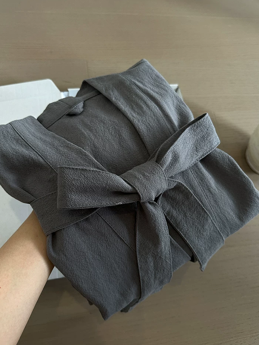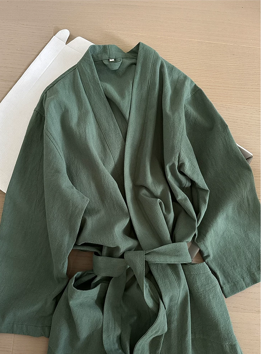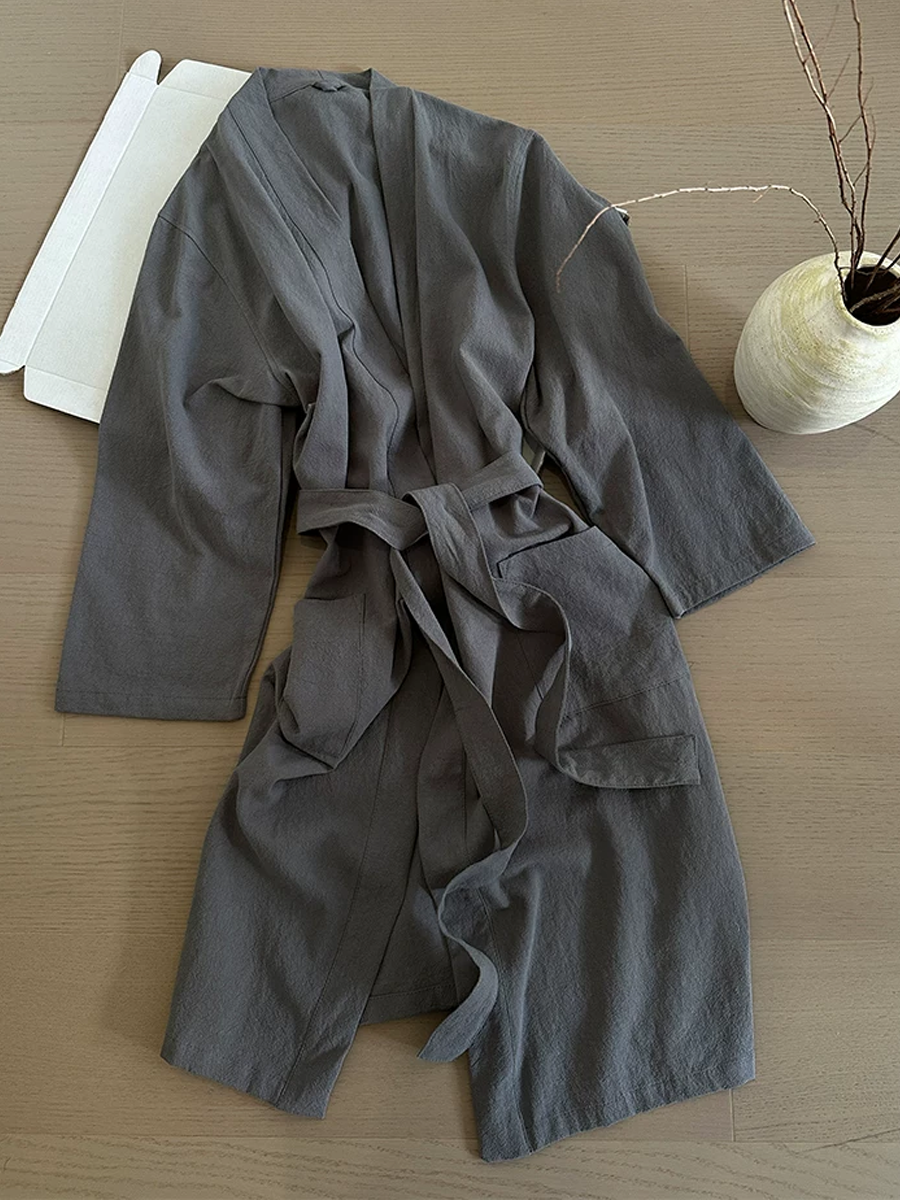 Our Cotton-Linen Bathrobe features a mid to long length that falls below the knee, crafted from a soft blend of 70% cotton and 30% linen. With its elegant pure color, this breathable and durable bathrobe is perfect for lounging at home or after a shower, offering a stylish and comfortable experience.
