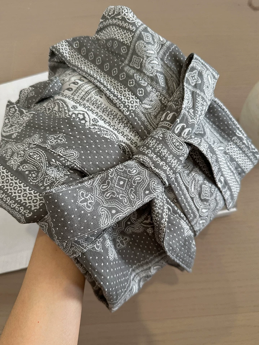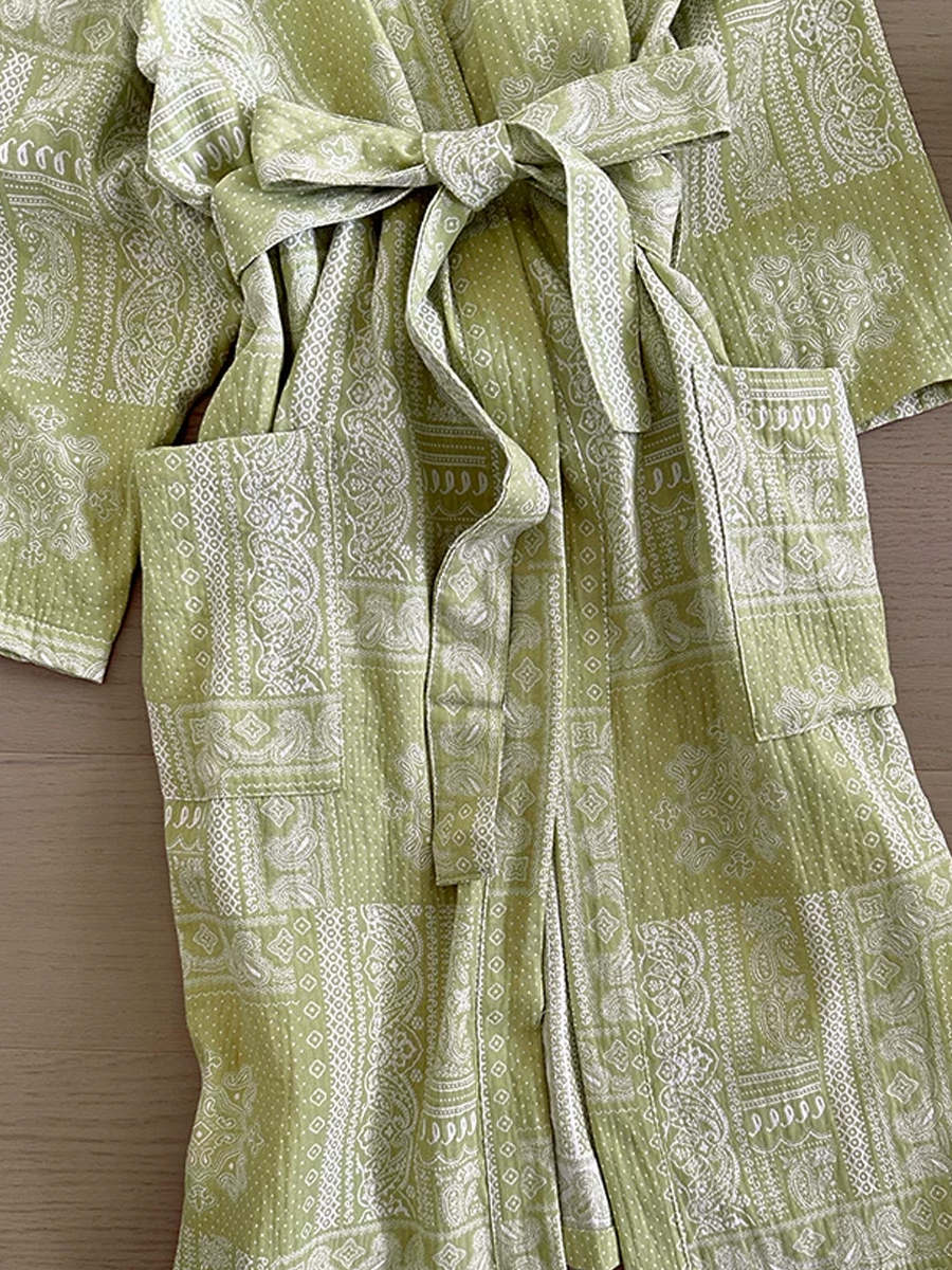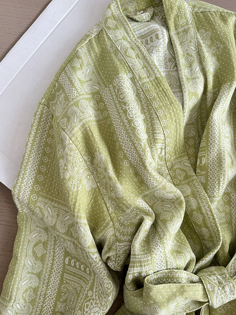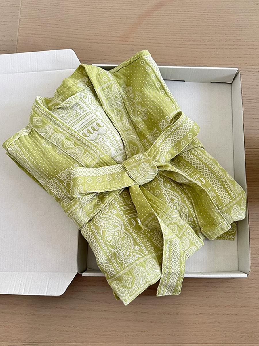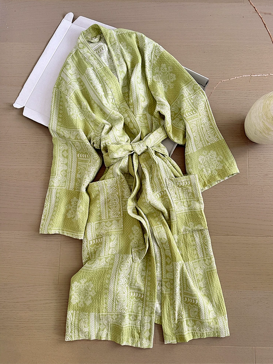 Our Cotton Gauze Bathrobe features a mid to long length that falls below the knee, crafted from 100% Cotton Gauze material. With its soft touch texture and elegant paisley floral pattern design, this breathable and durable bathrobe is perfect for lounging at home or after a shower, offering a stylish and comfortable experience.