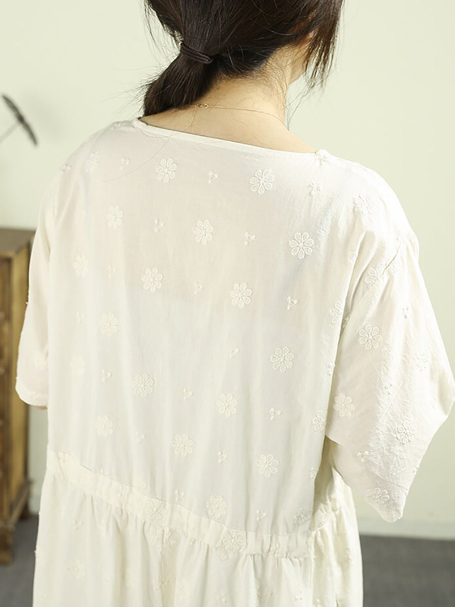 Women Summer Artsy Embroidery 100%Cotton V-Neck Dress