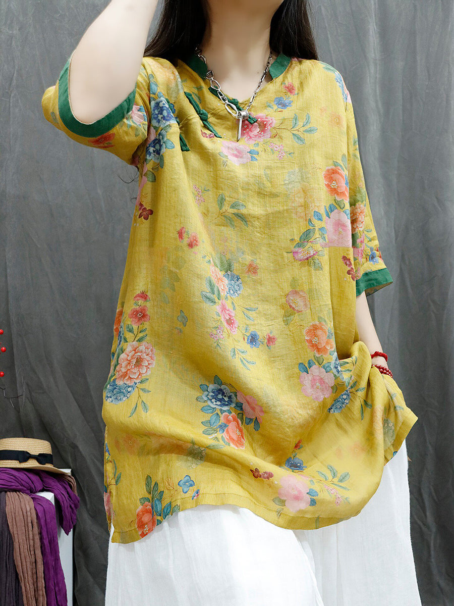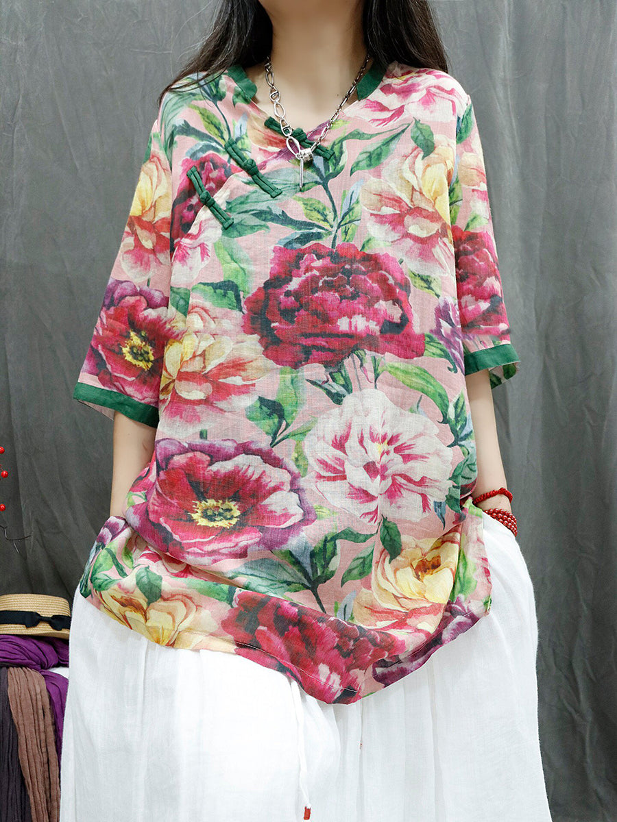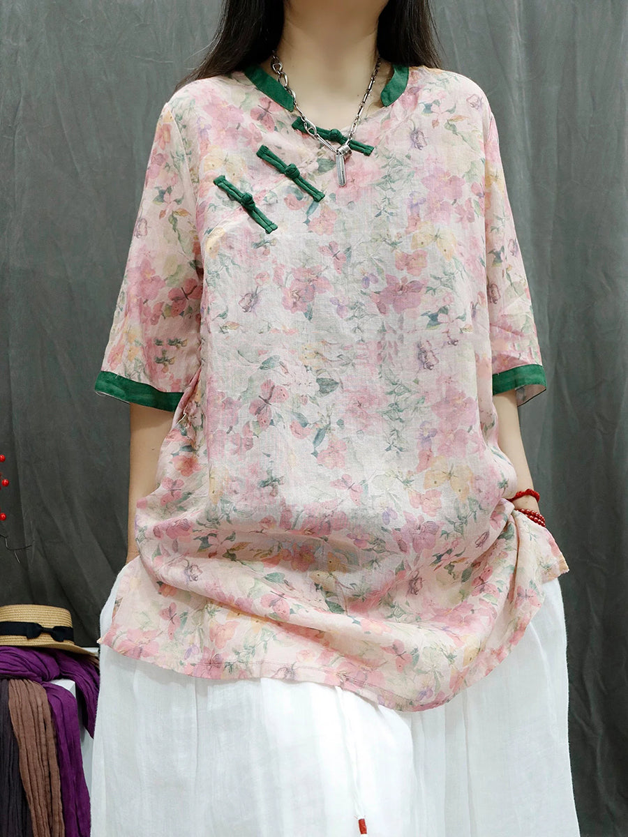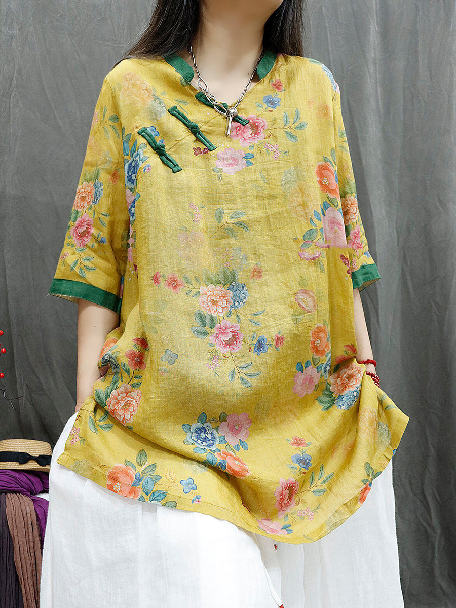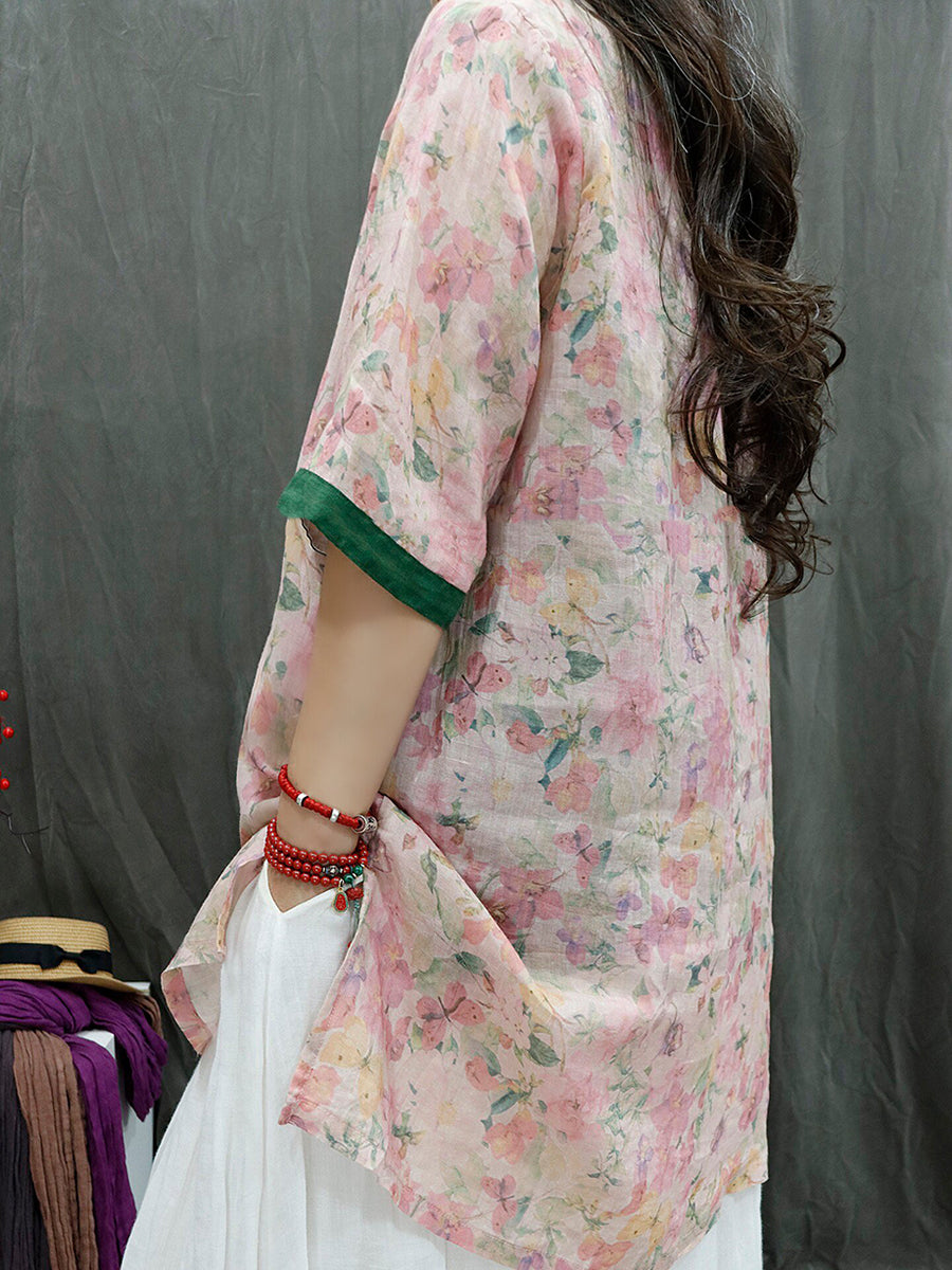 Women Summer Ethnic Flower 100%Ramie Blouse