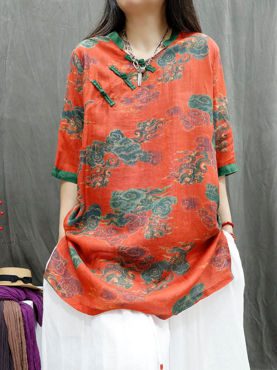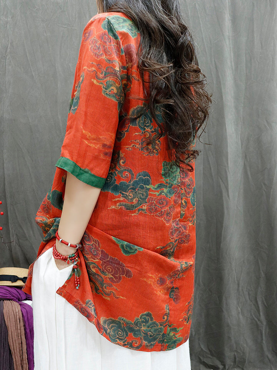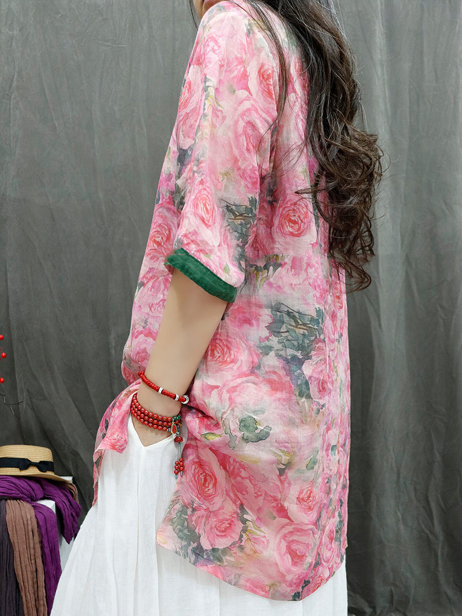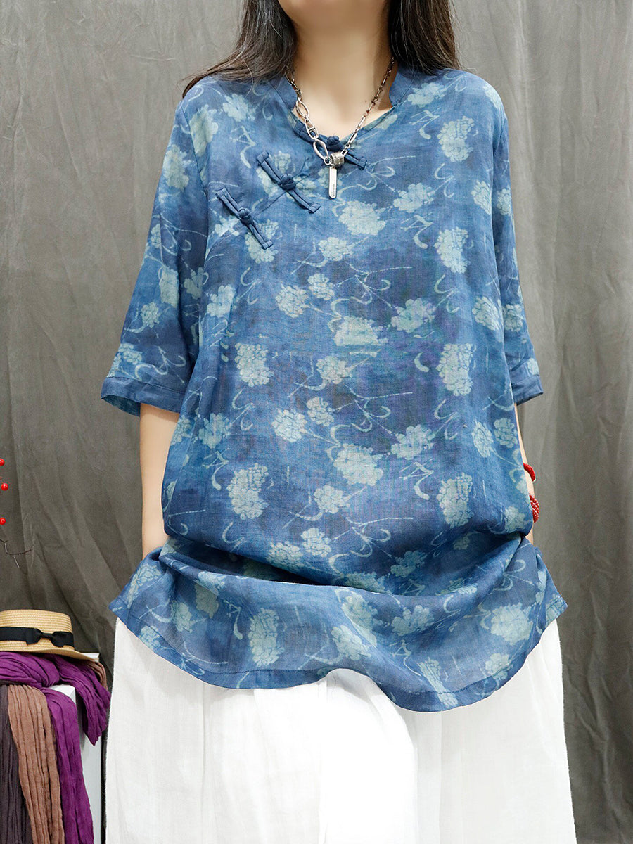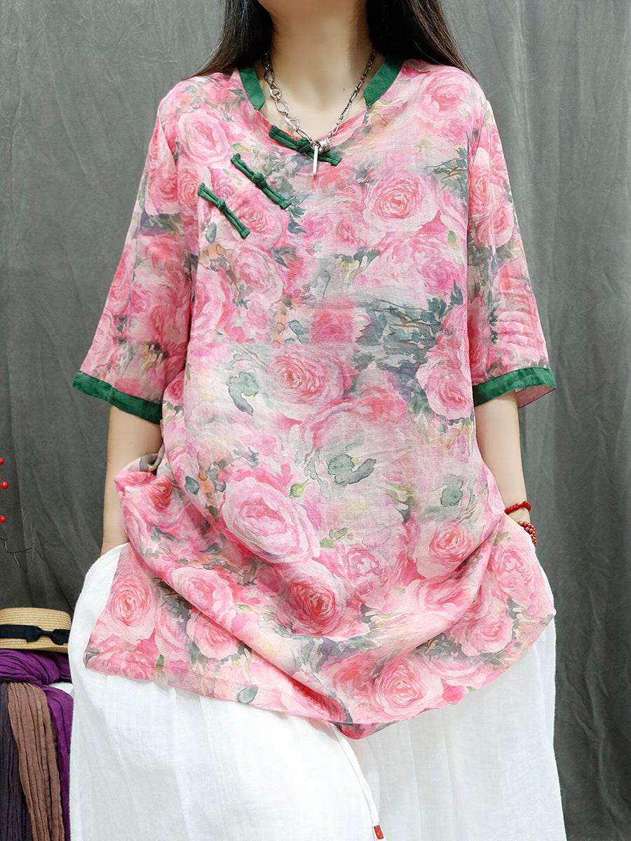 Women Summer Ethnic Flower 100%Ramie Blouse
