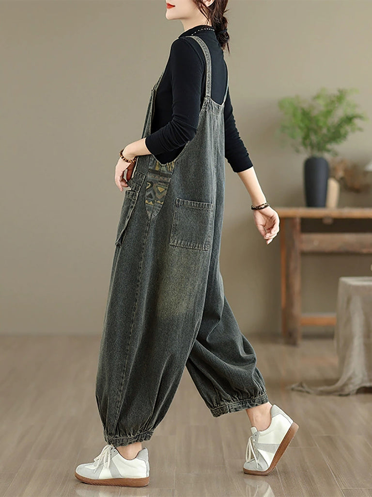 Women Vintage Autumn Embroidery Denim V-Neck Coat