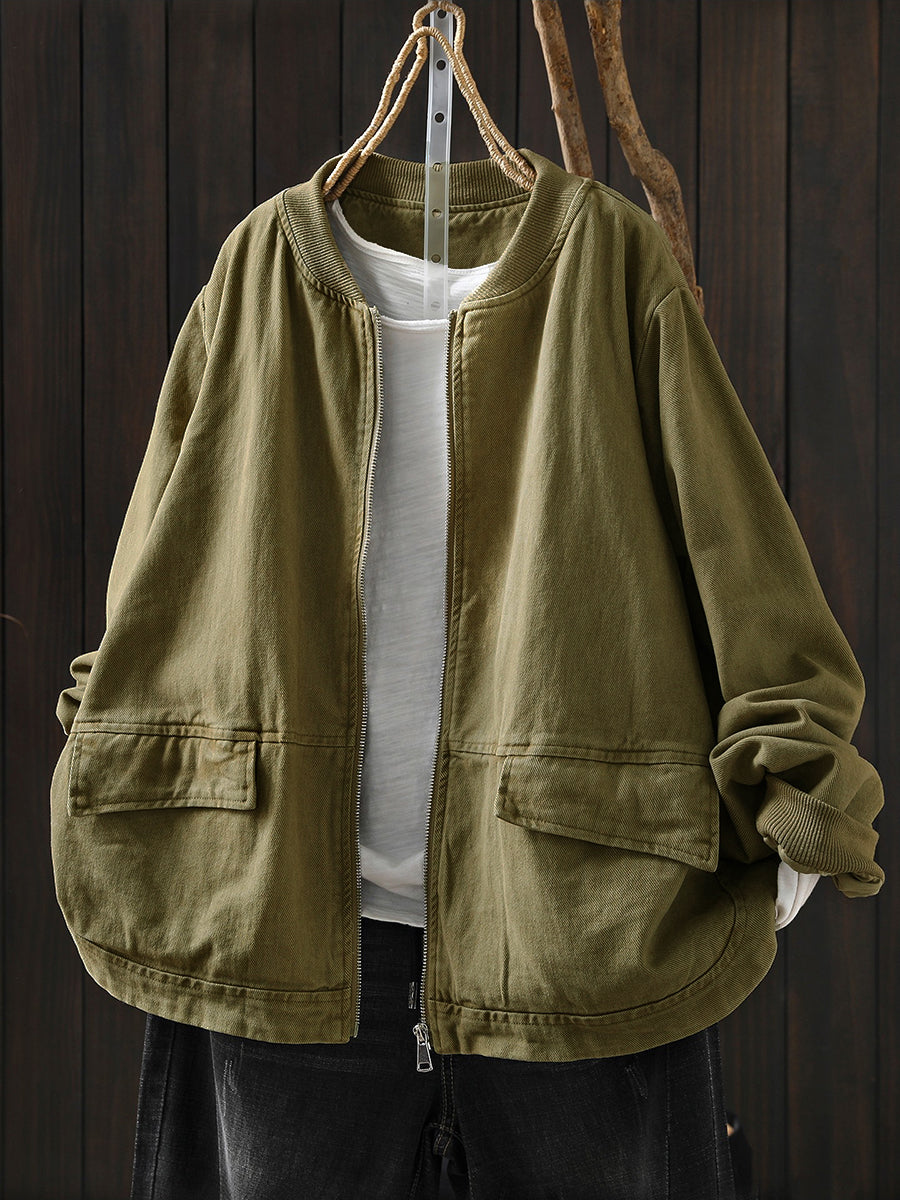 Women Spring Casual Pure Color Cotton Zipper Jacket