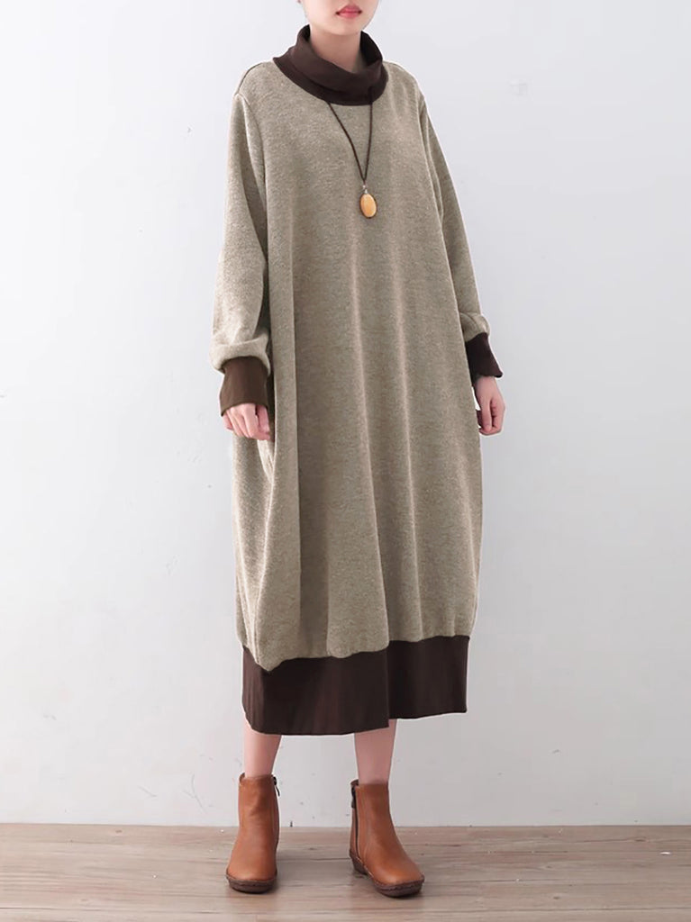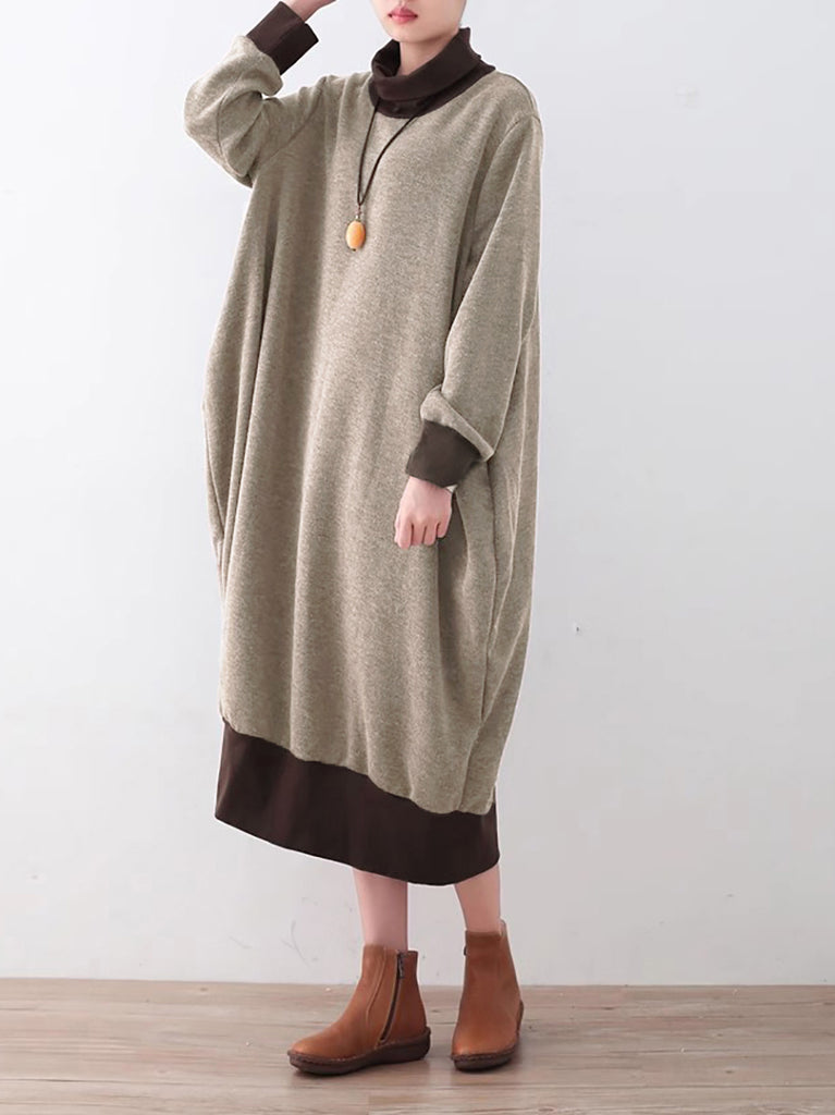 Plus Size Women Vintage Autumn Colorblock Turtleneck Dress