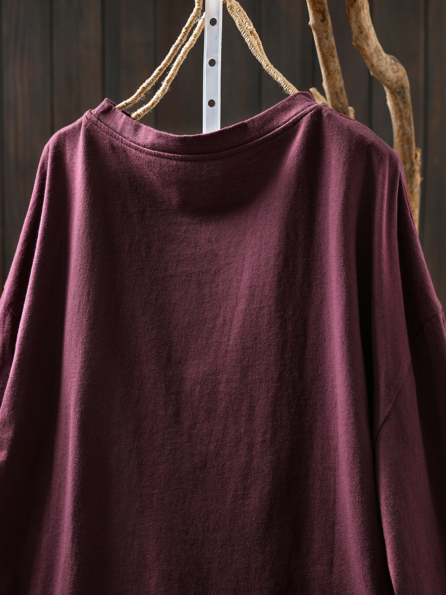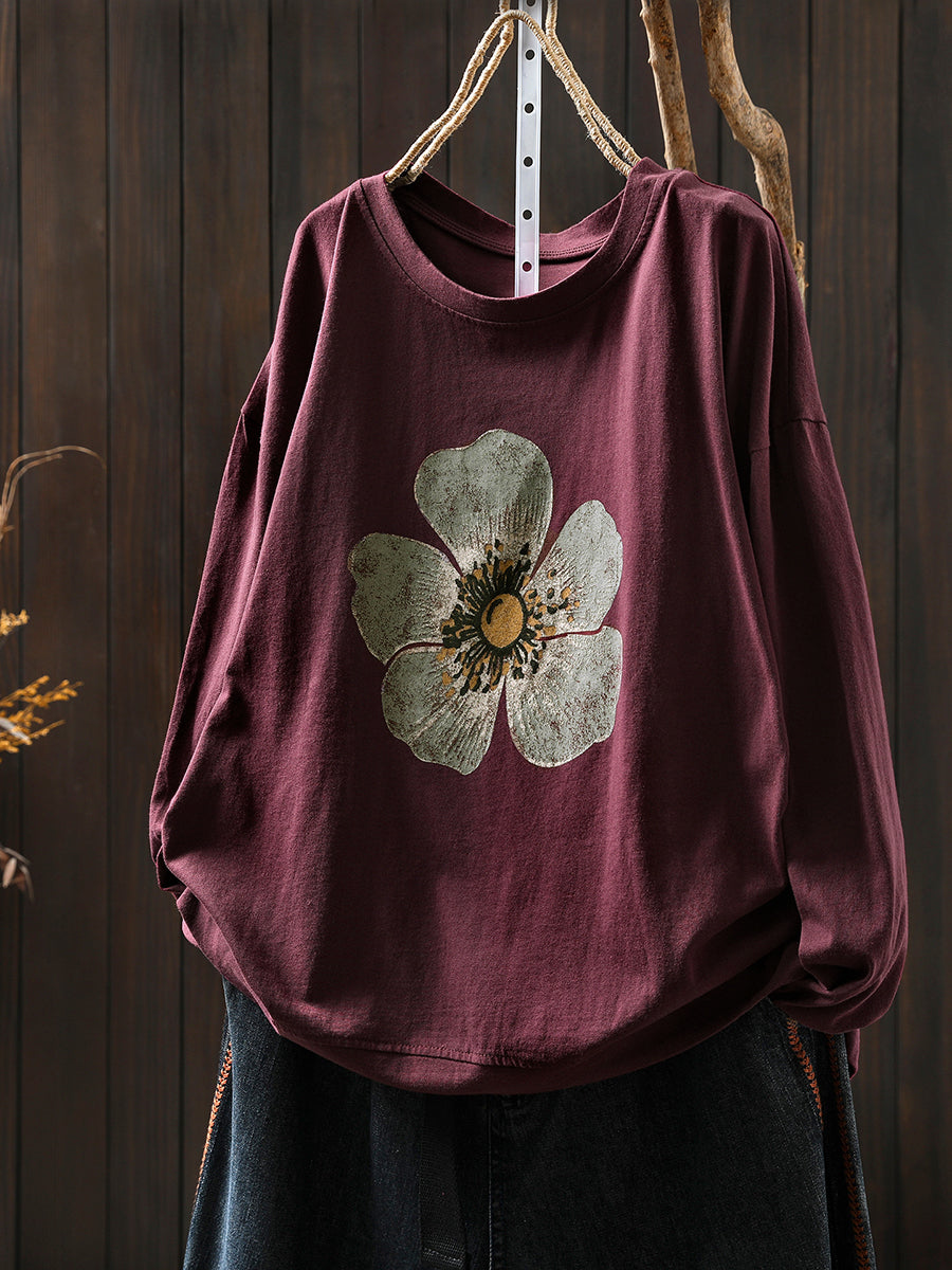 Plus Size Women Autumn Artsy Flower O-Neck Cotton Blouse