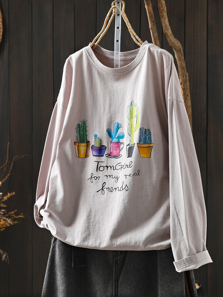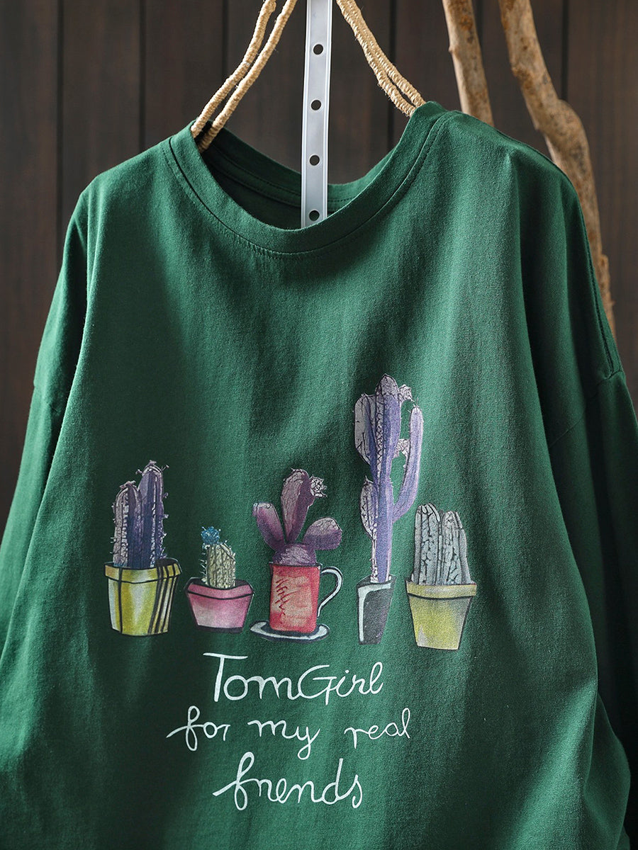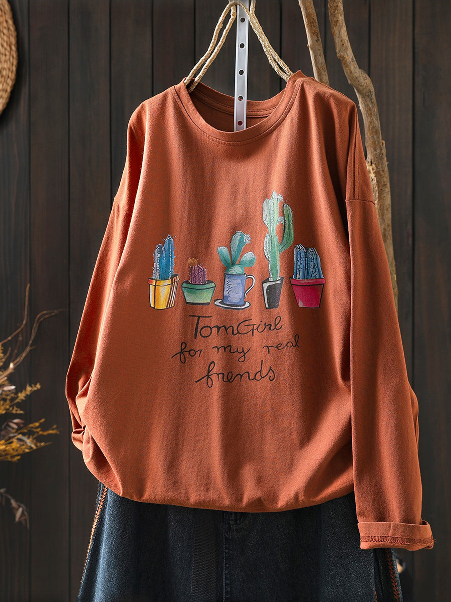 Women Artsy Spring Potted Plant Cotton O-Neck Blouse