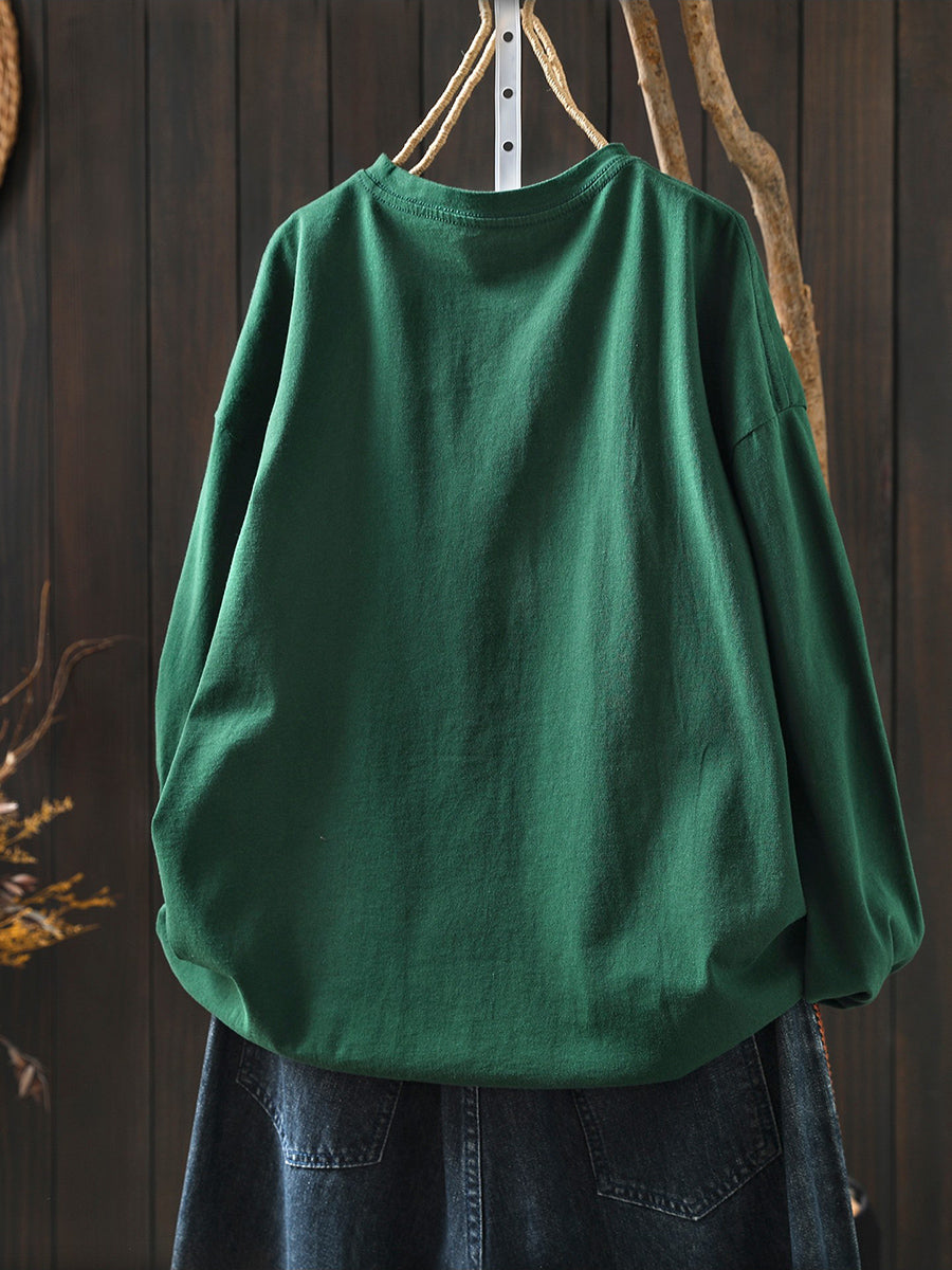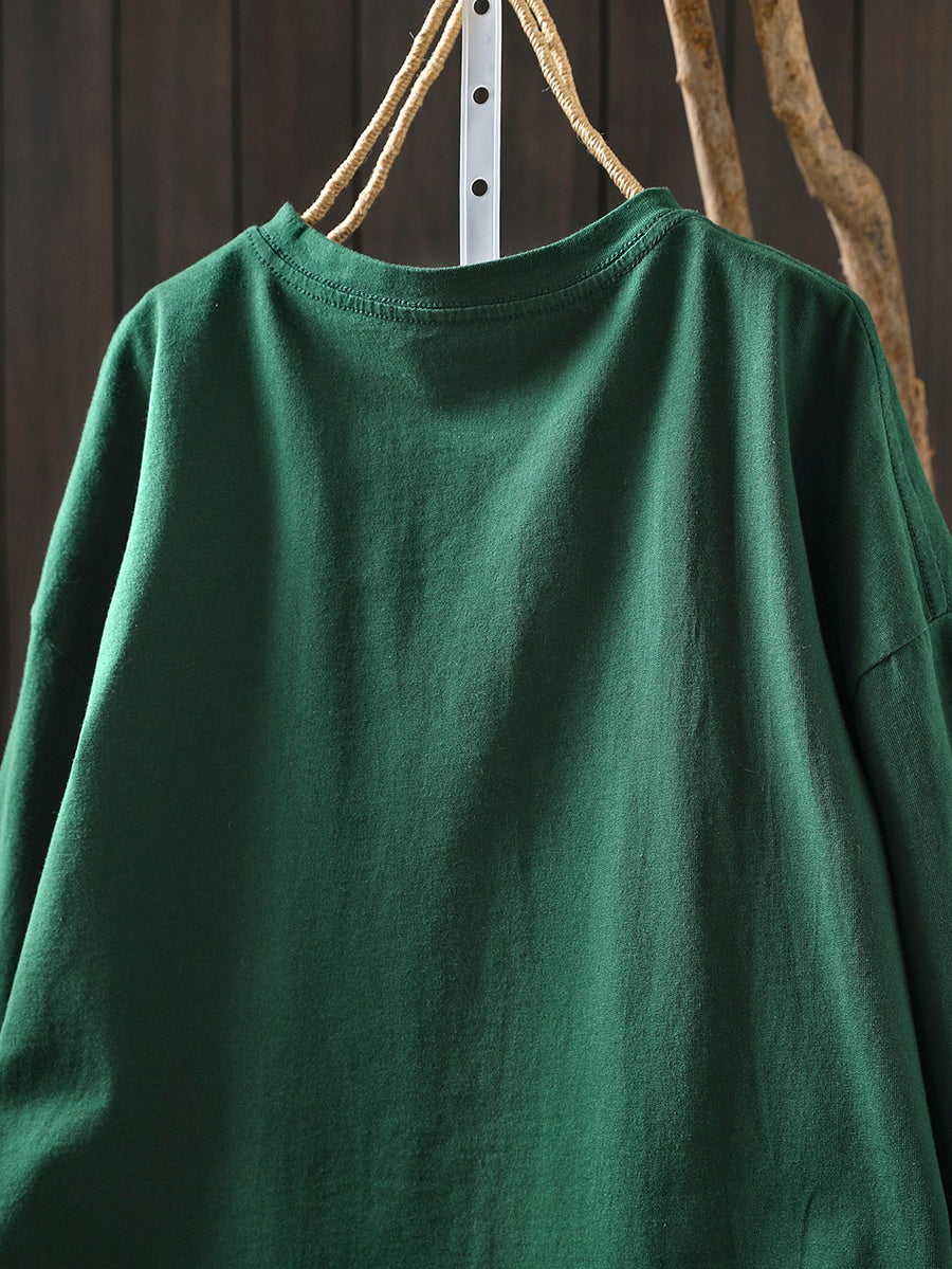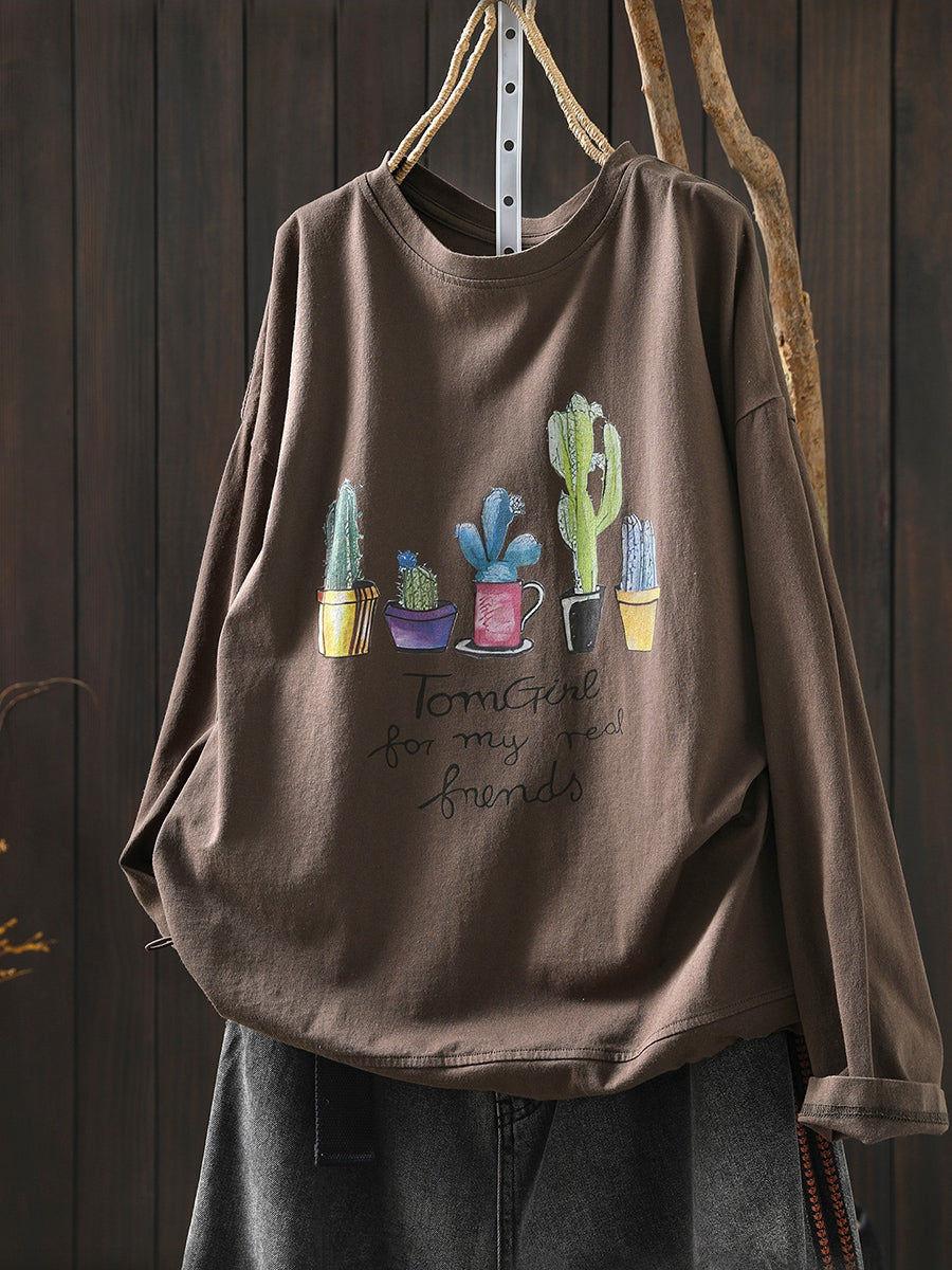 Women Artsy Spring Potted Plant Cotton O-Neck Blouse