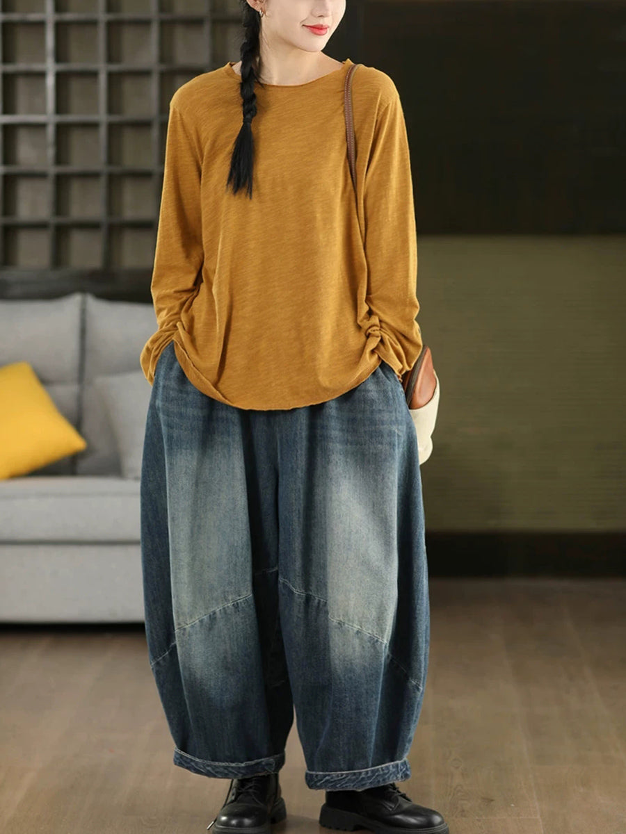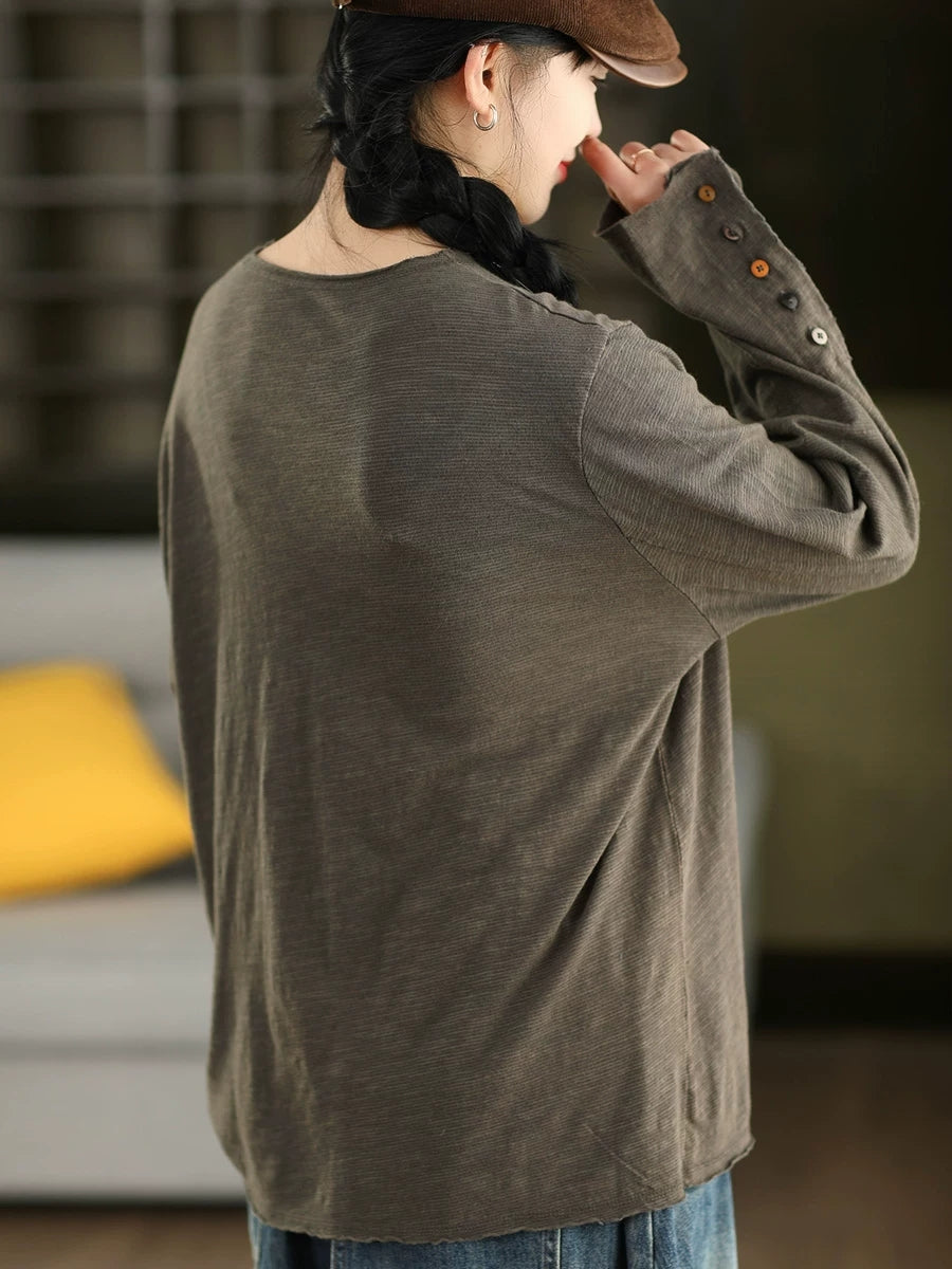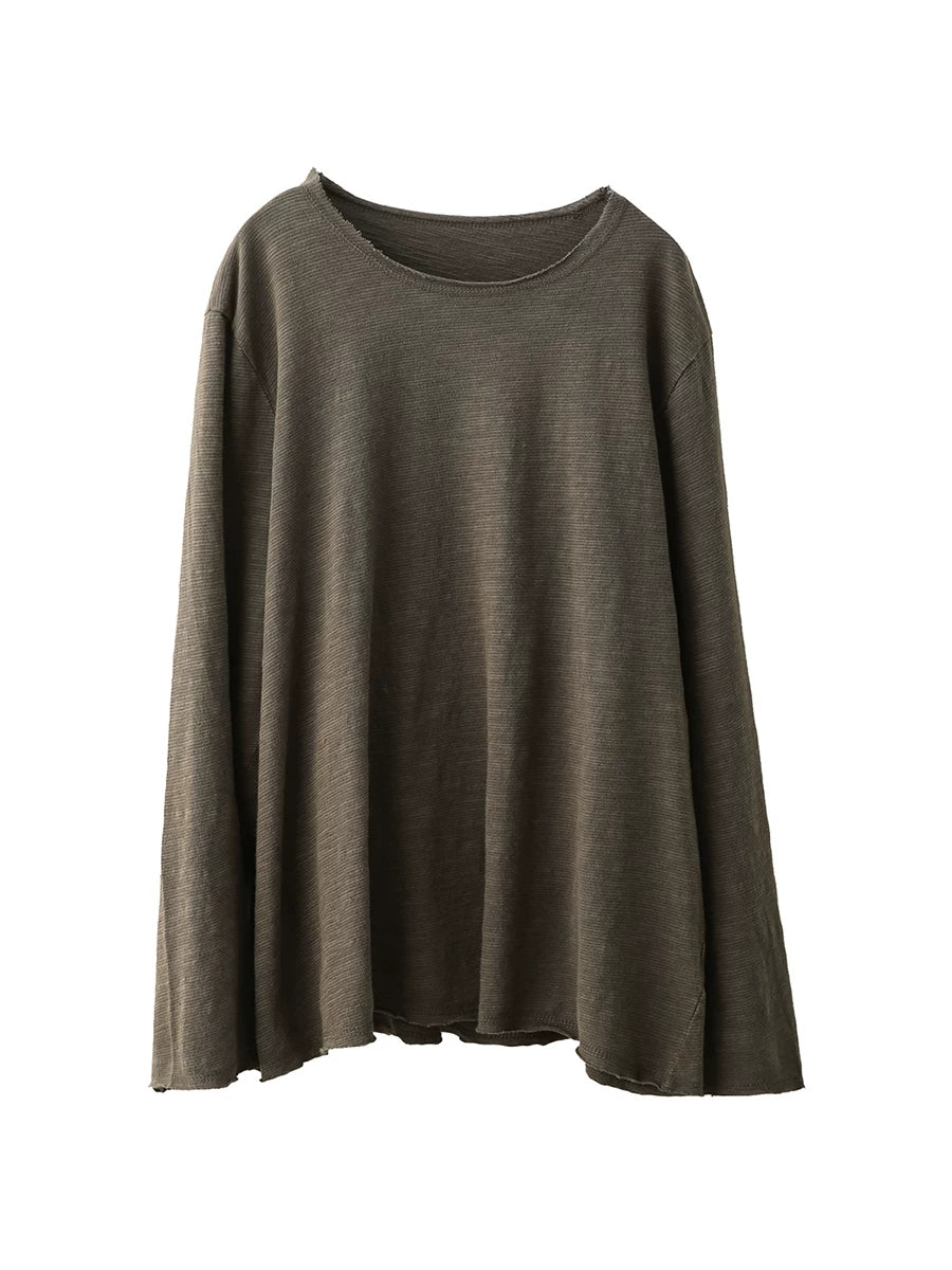 Women Artsy Spring Pure Color Cotton O-Neck Blouse