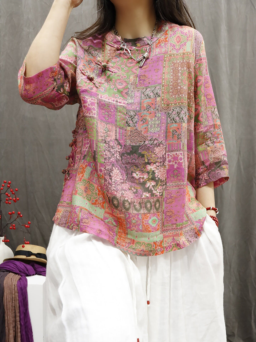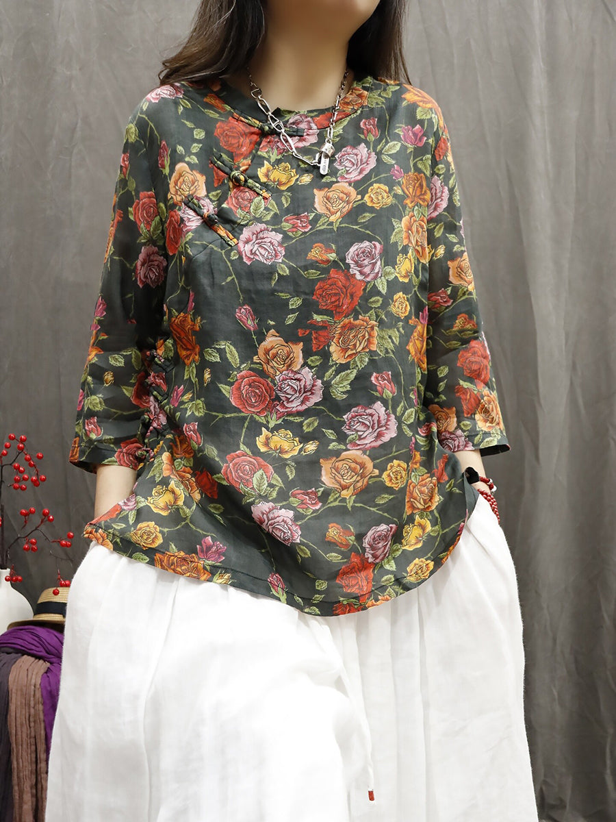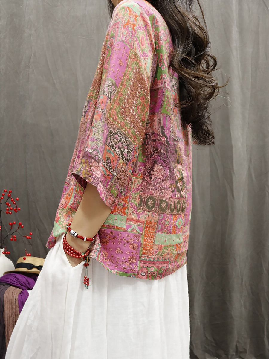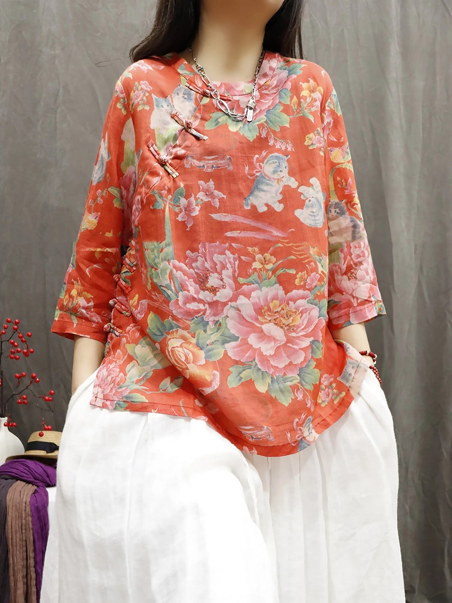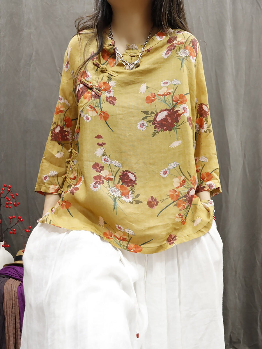 Women Summer Ethnic Flower 100%Ramie O-Neck Blouse
