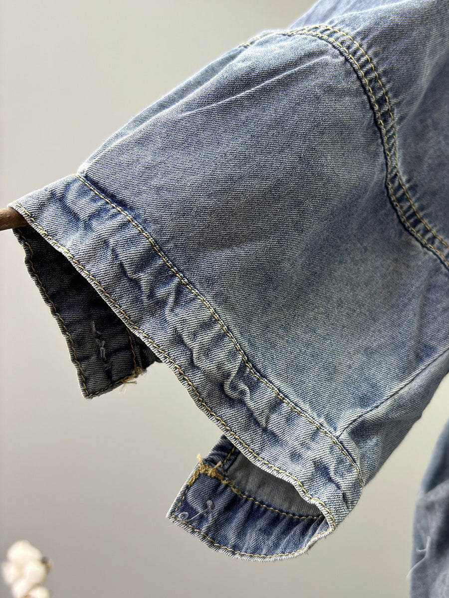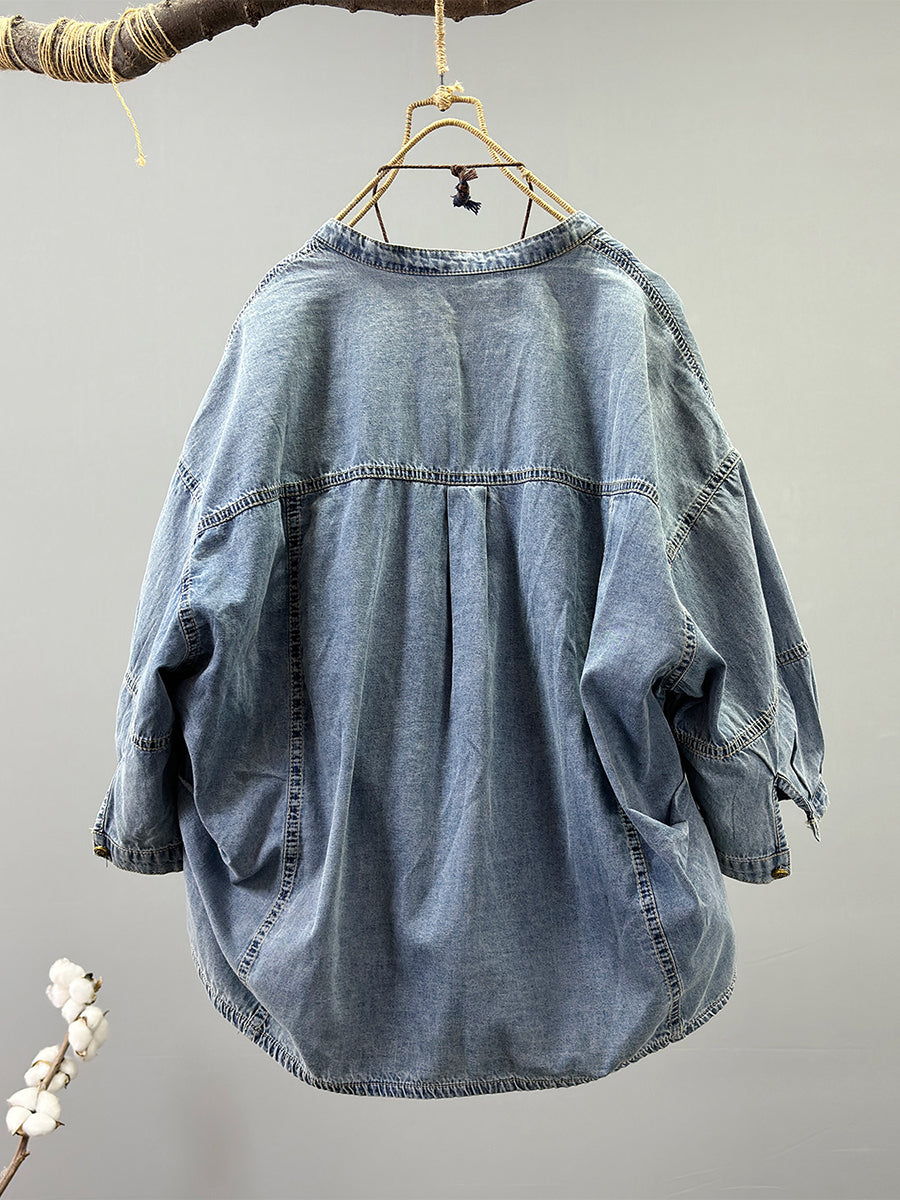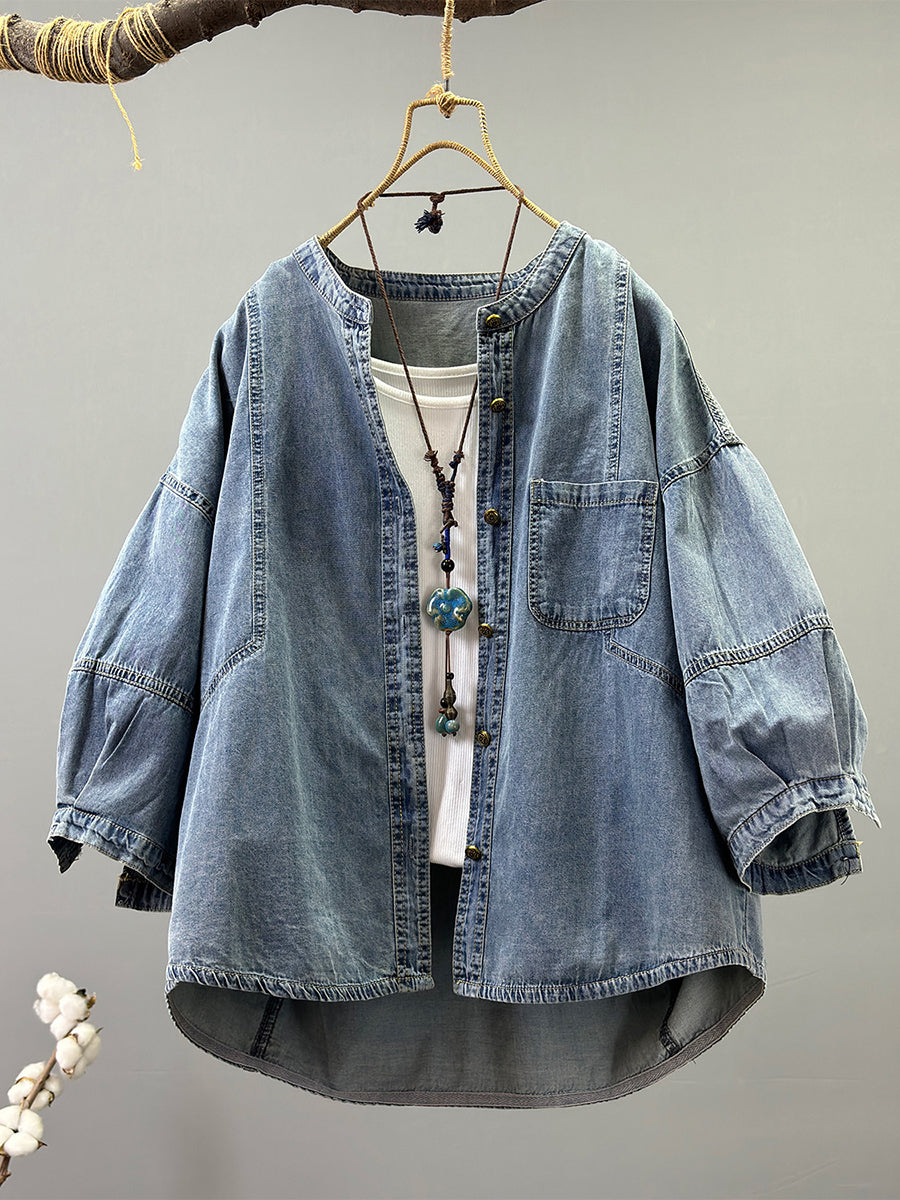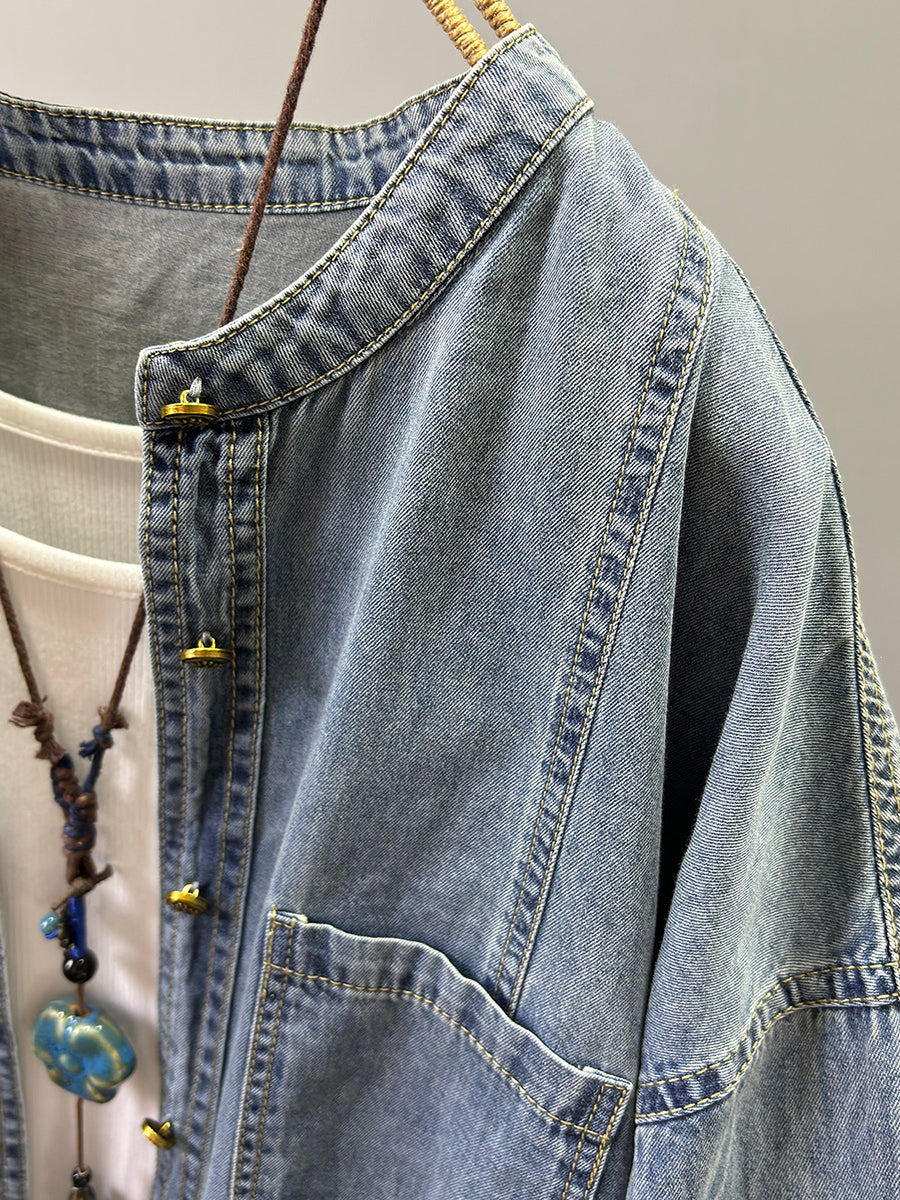 Women Spring Retro Pure Color O-Neck Denim Jacket