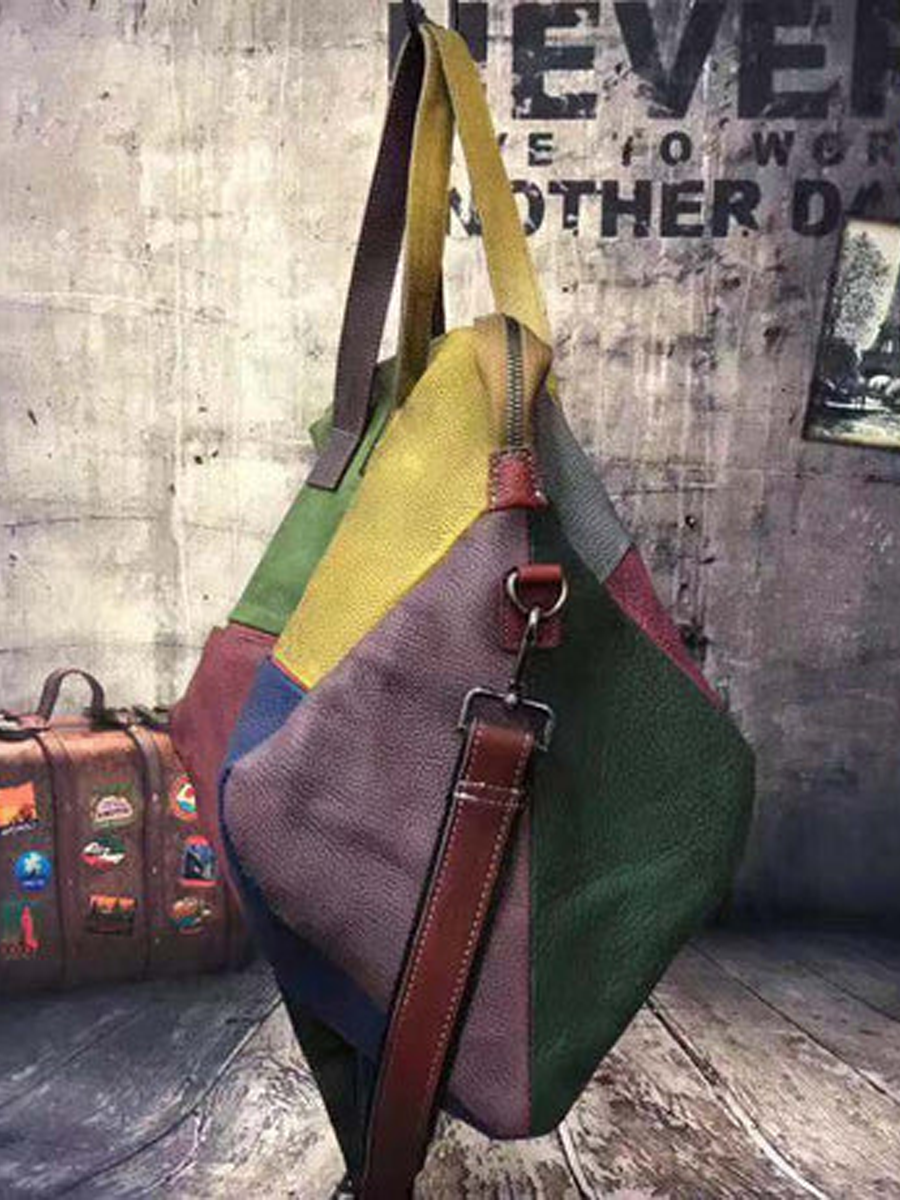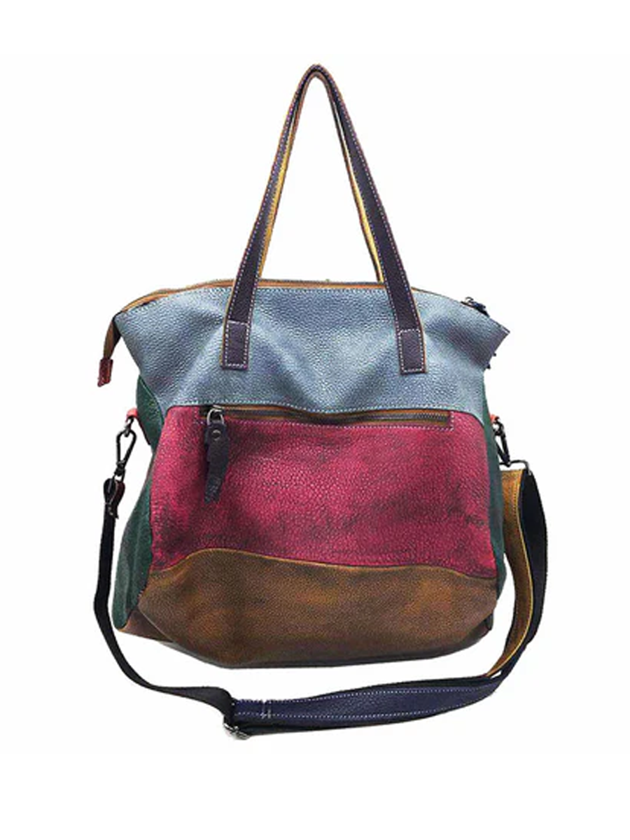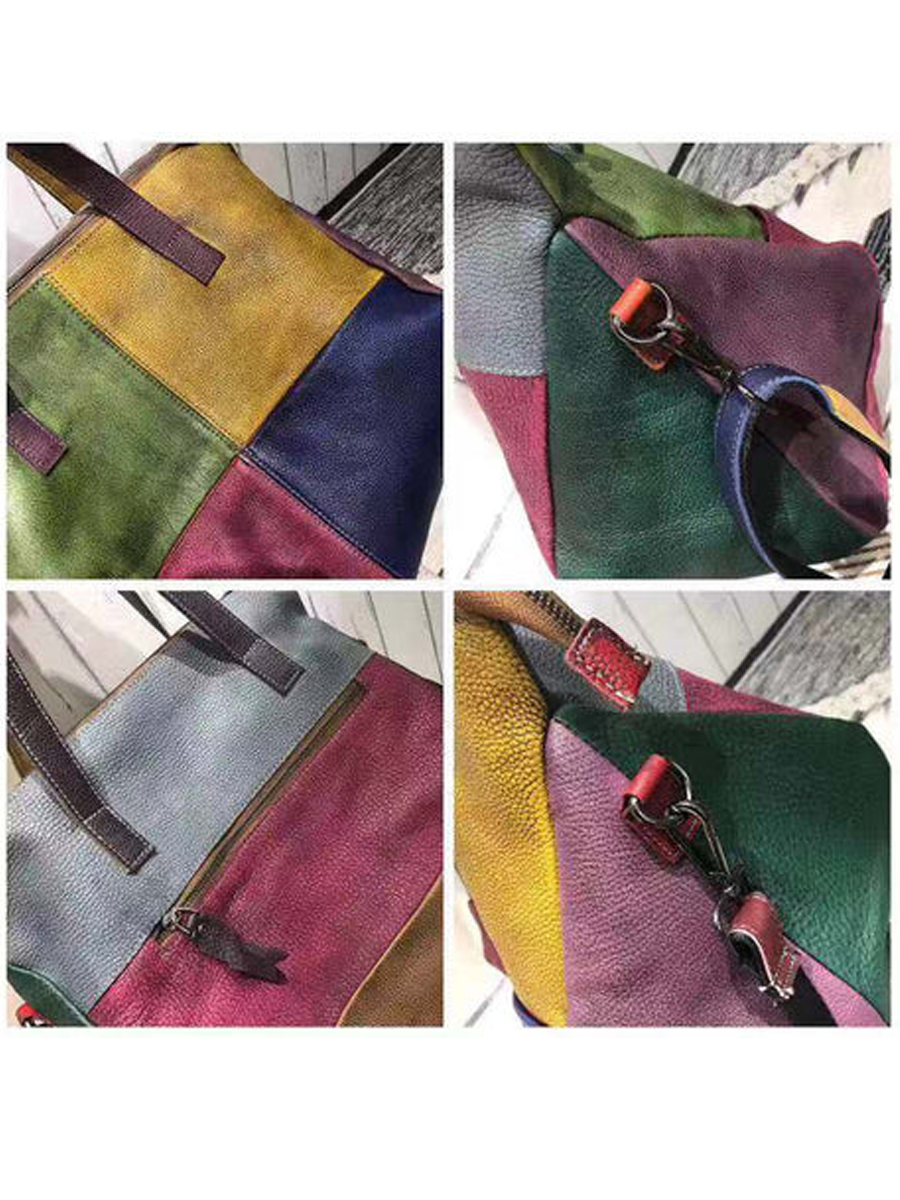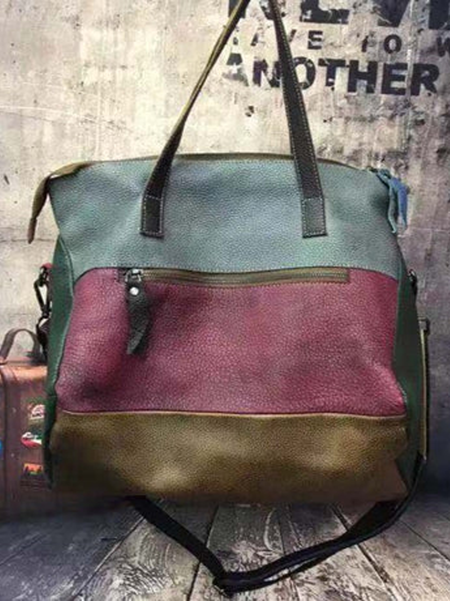 Vintage Leather Color Contrast Large Capacity Shoulder Bag