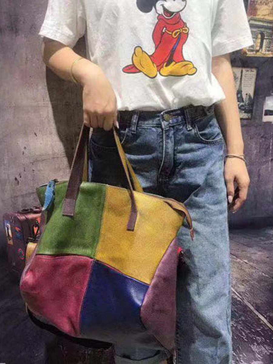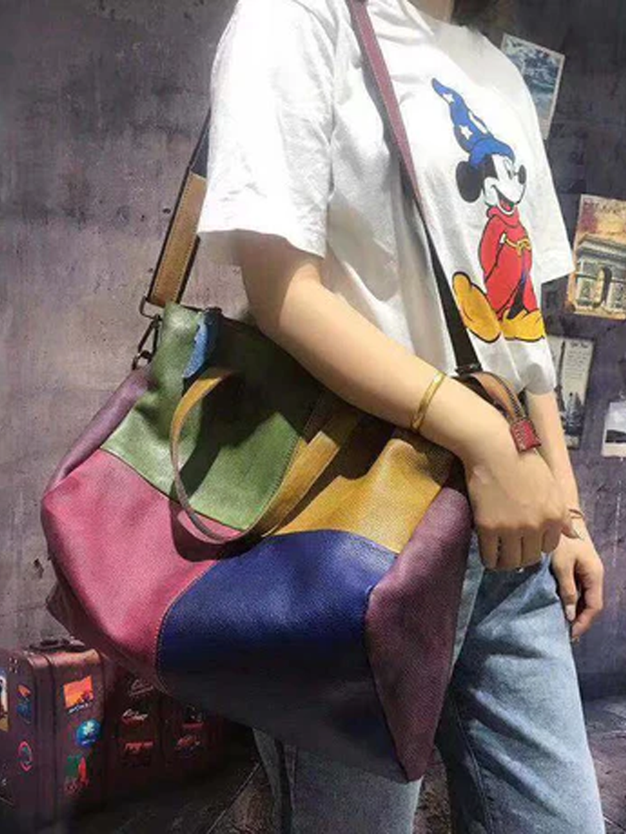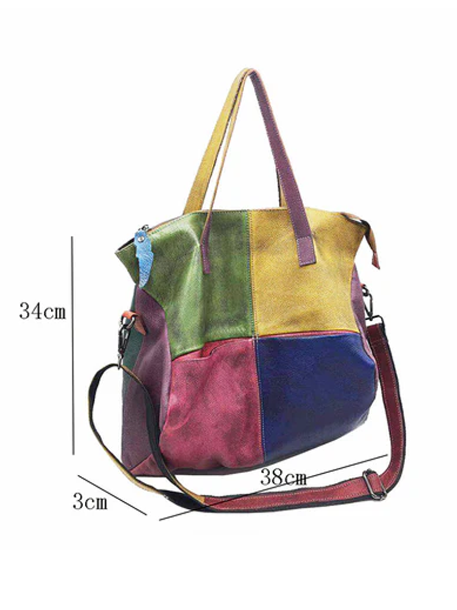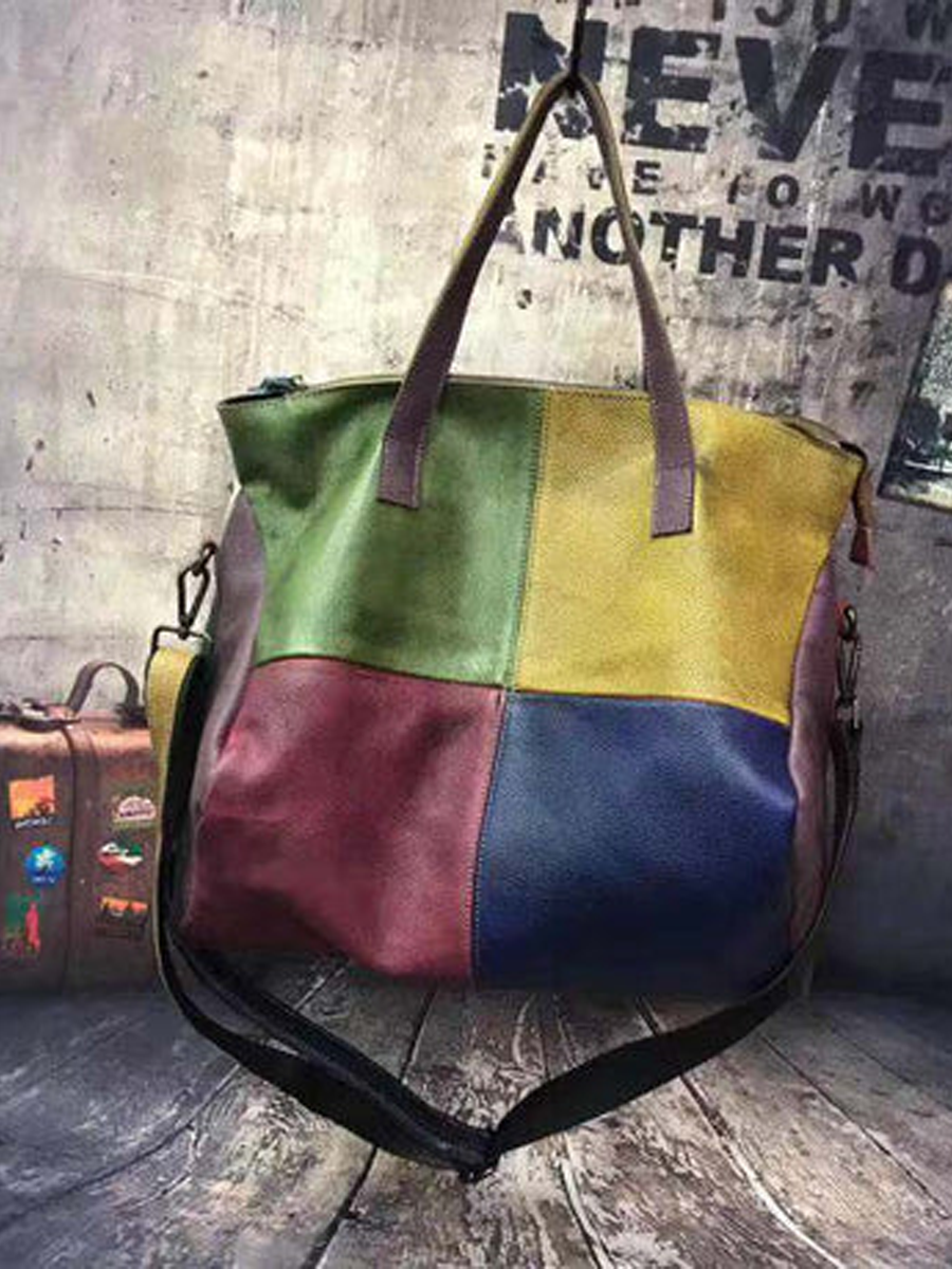 Vintage Leather Color Contrast Large Capacity Shoulder Bag