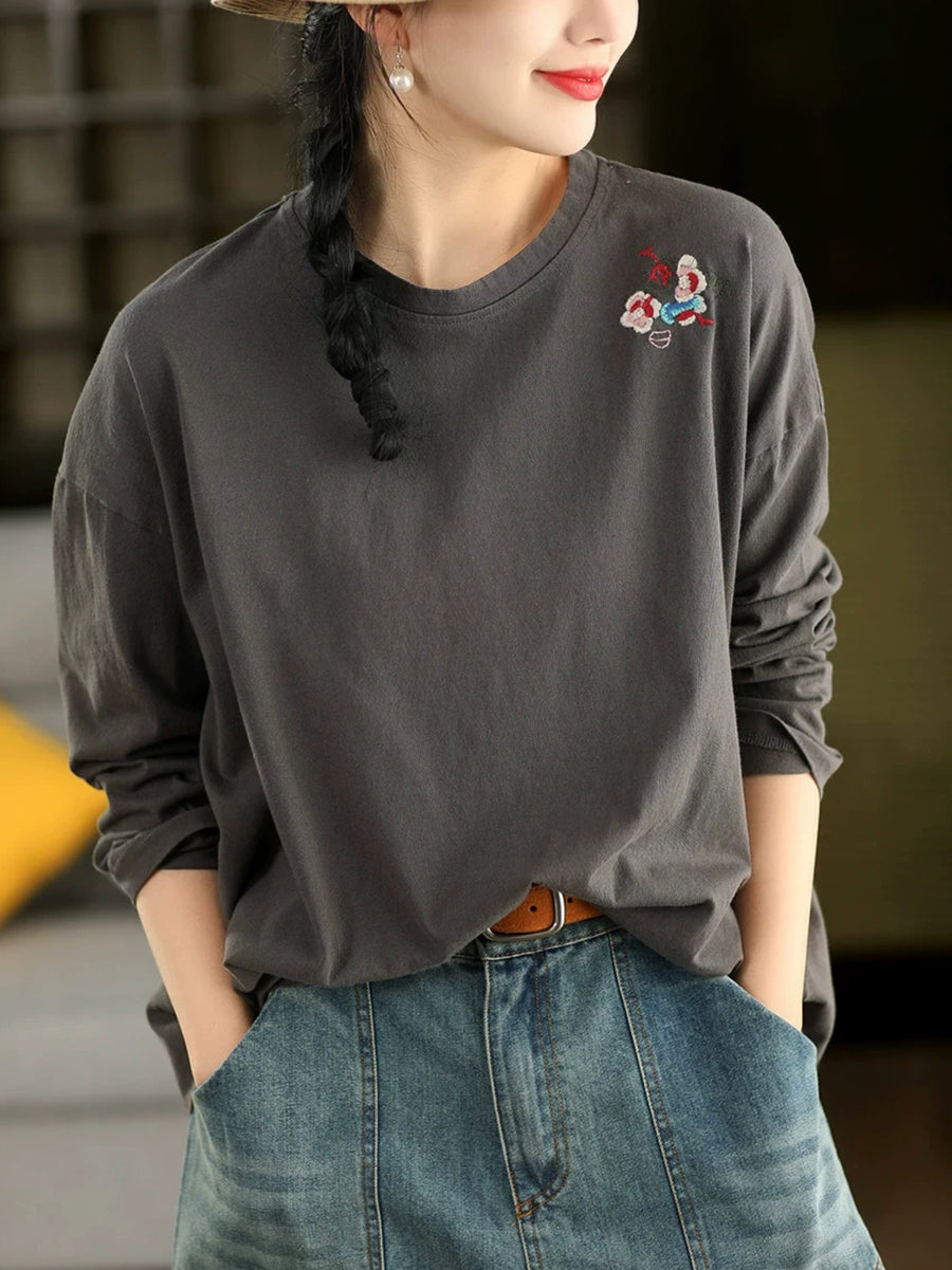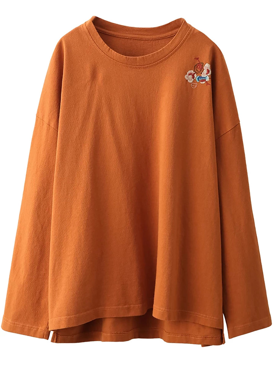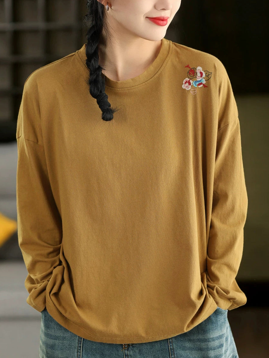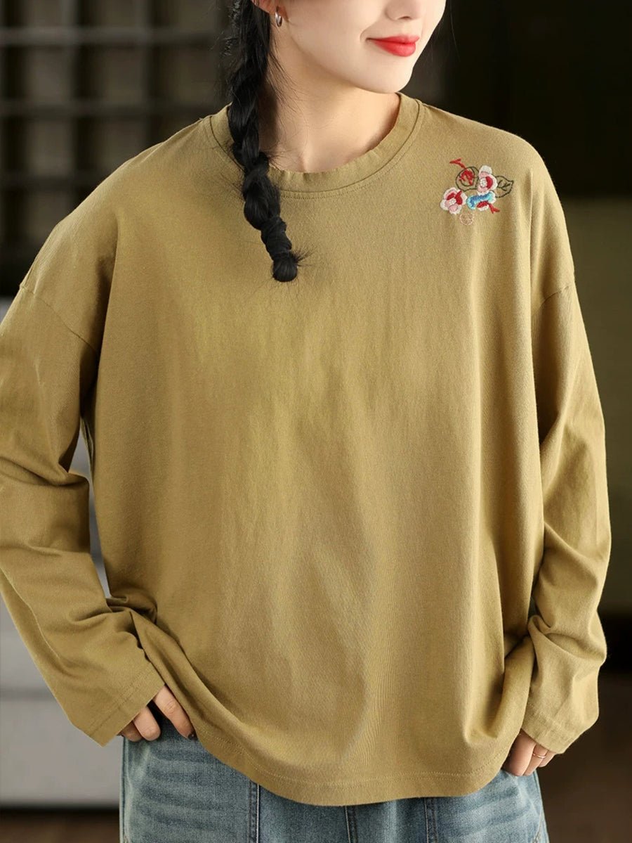 Women Spring Artsy Embroidery 100%Cotton O-Neck Blouse