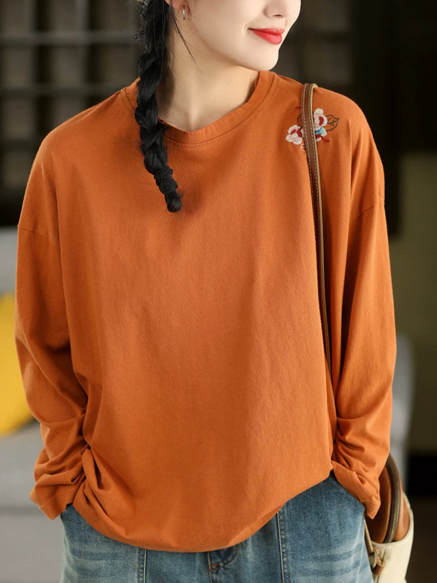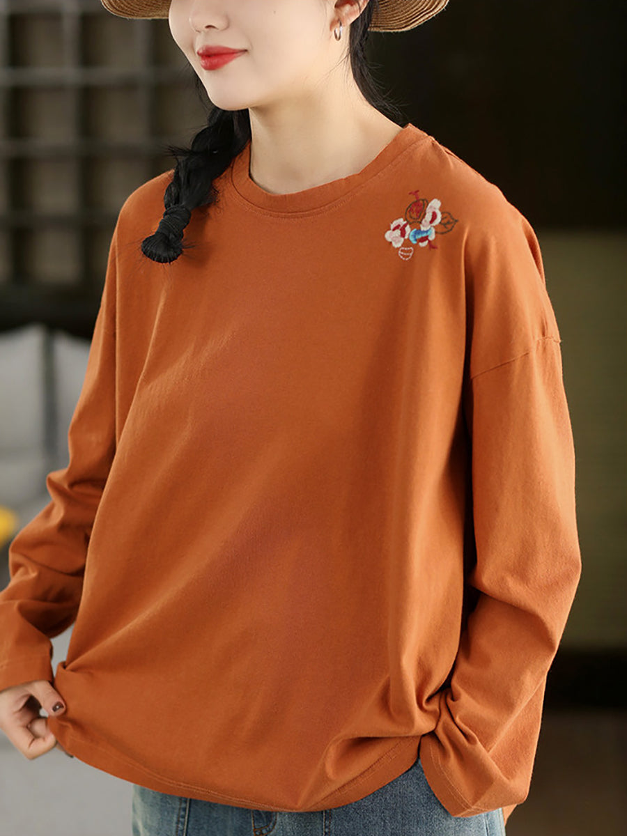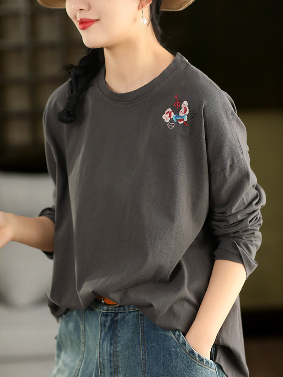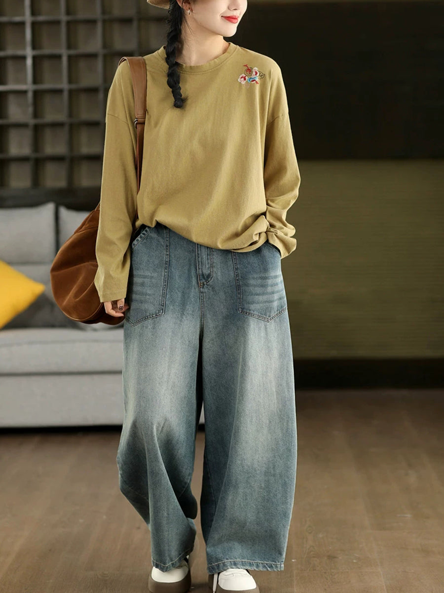Women Spring Artsy Embroidery 100%Cotton O-Neck Blouse