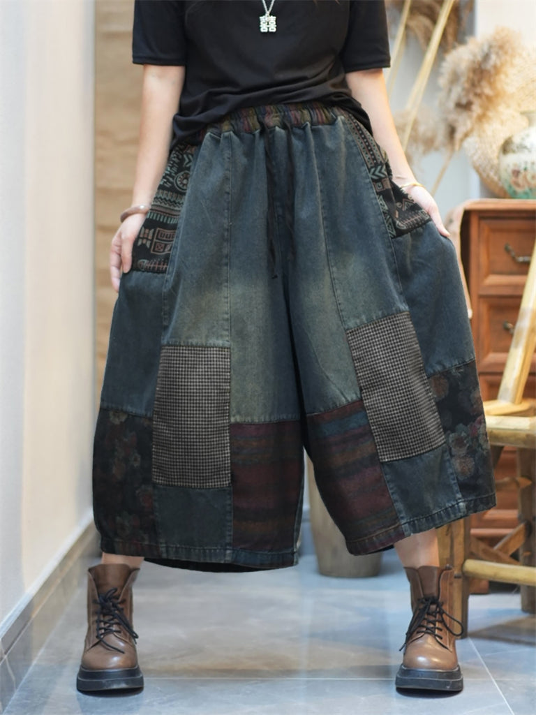Women Retro Summer Denim Colorblock Wide-leg Pants