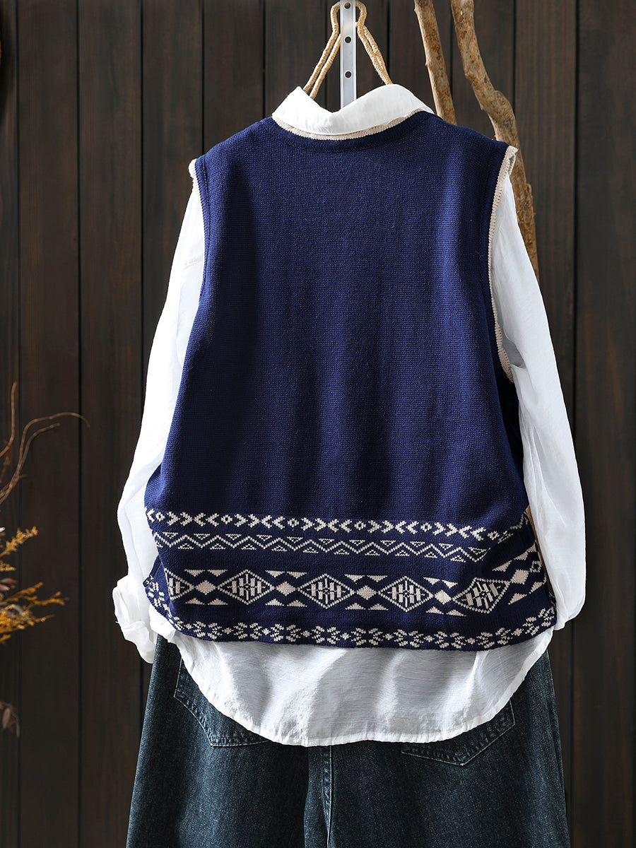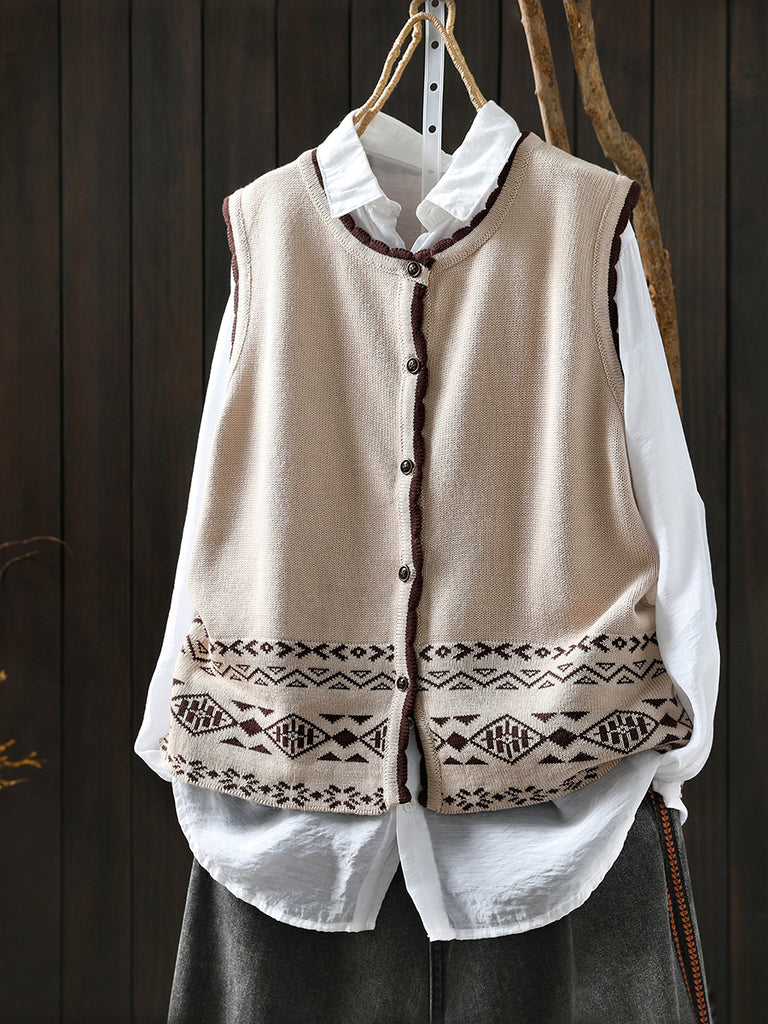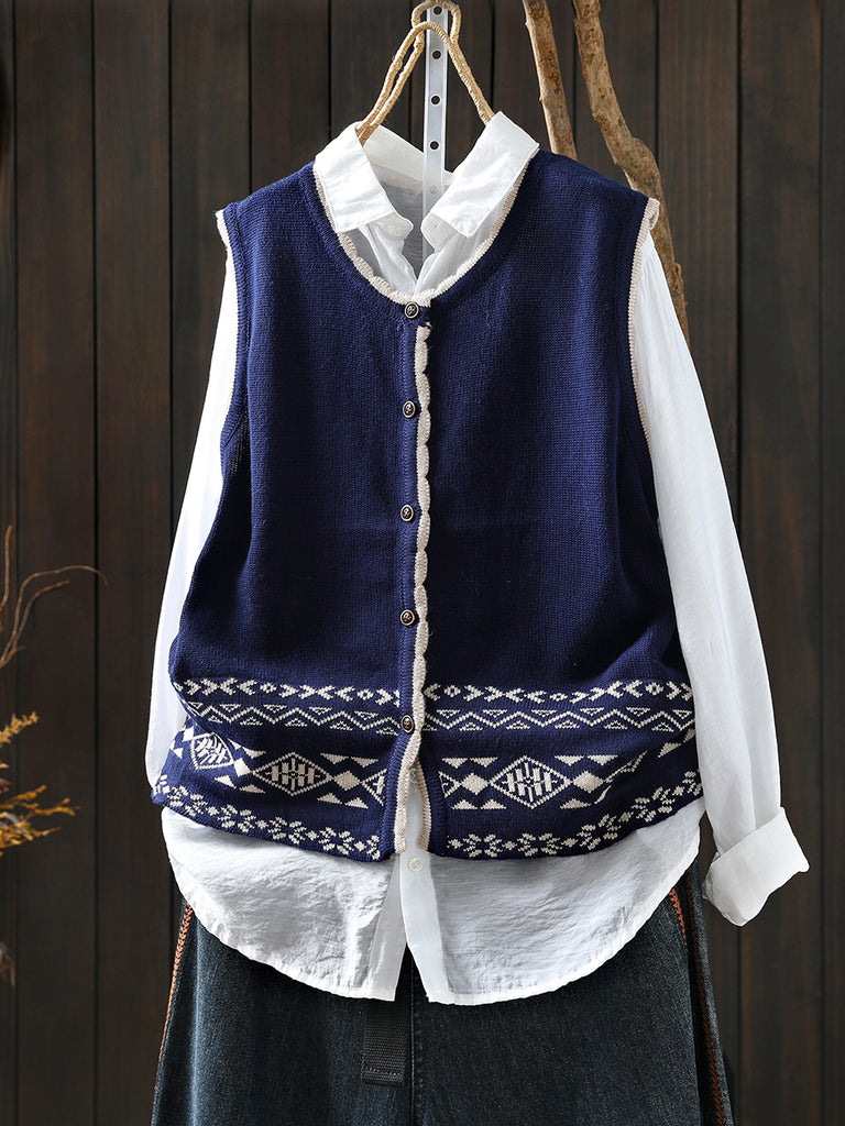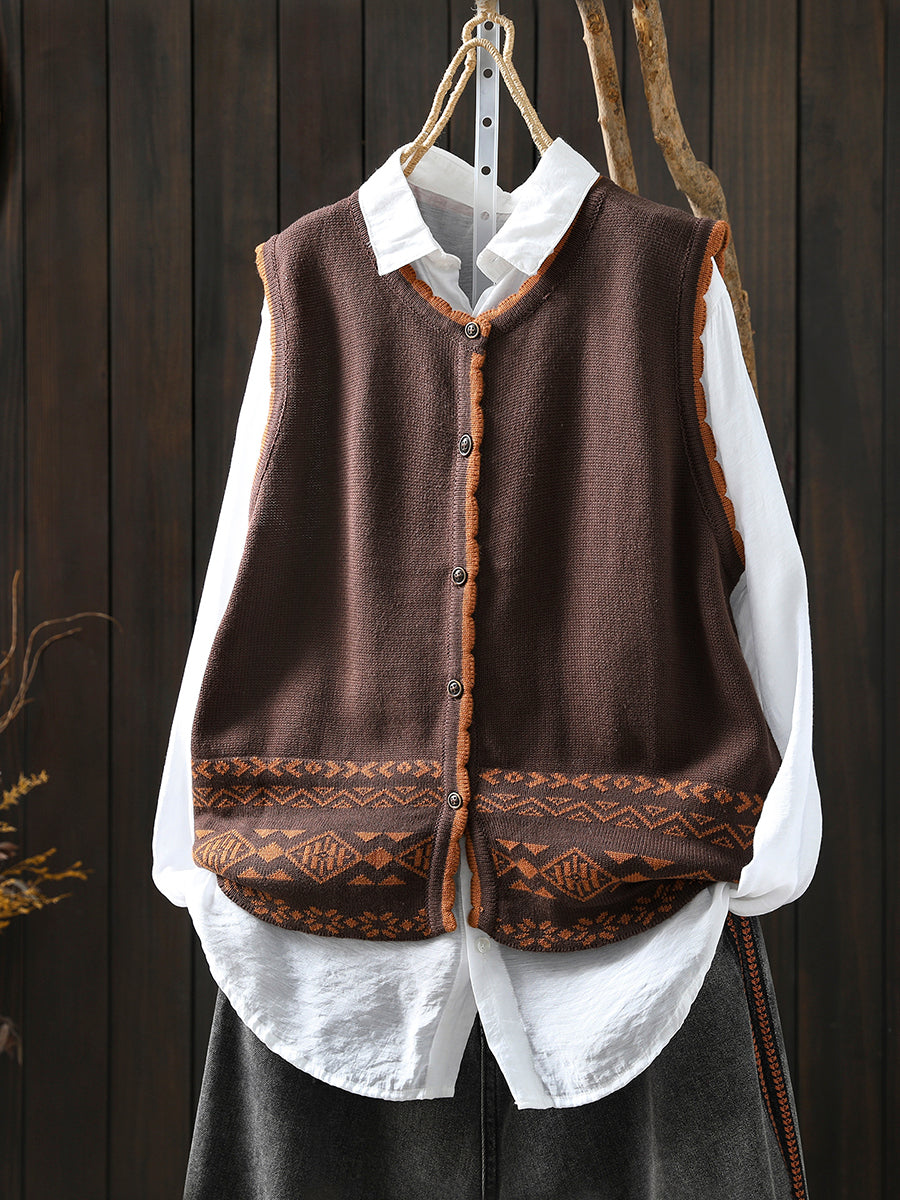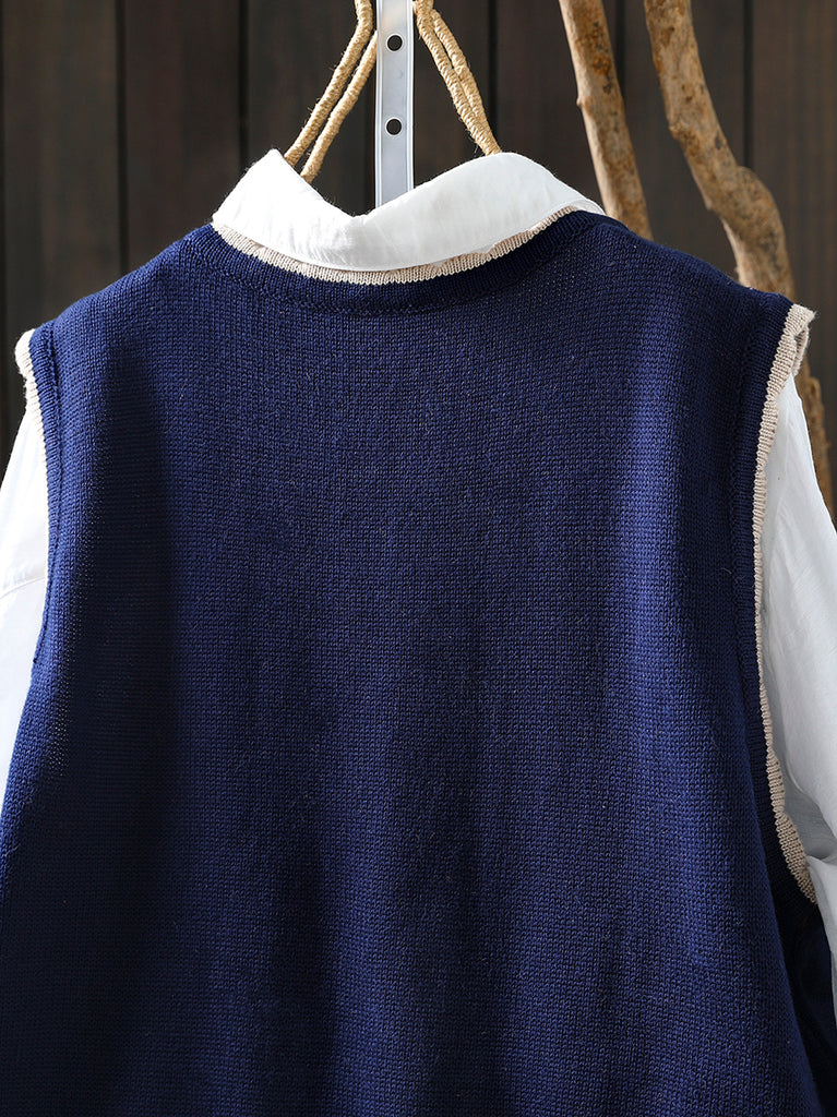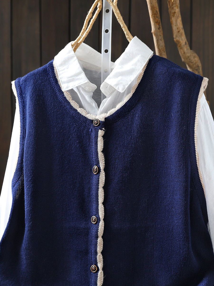 This knitted vest combines functionality with timeless design through its thoughtfully balanced fiber composition of 55% cotton and 45% acrylic. The round neckline and retro-inspired silhouette offer sophisticated styling options for layering during autumn and winter months. The knit structure provides optimal temperature regulation and flexibility, making it a reliable wardrobe staple across seasonal transitions.