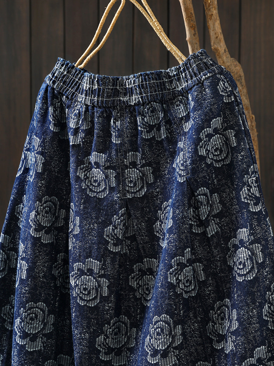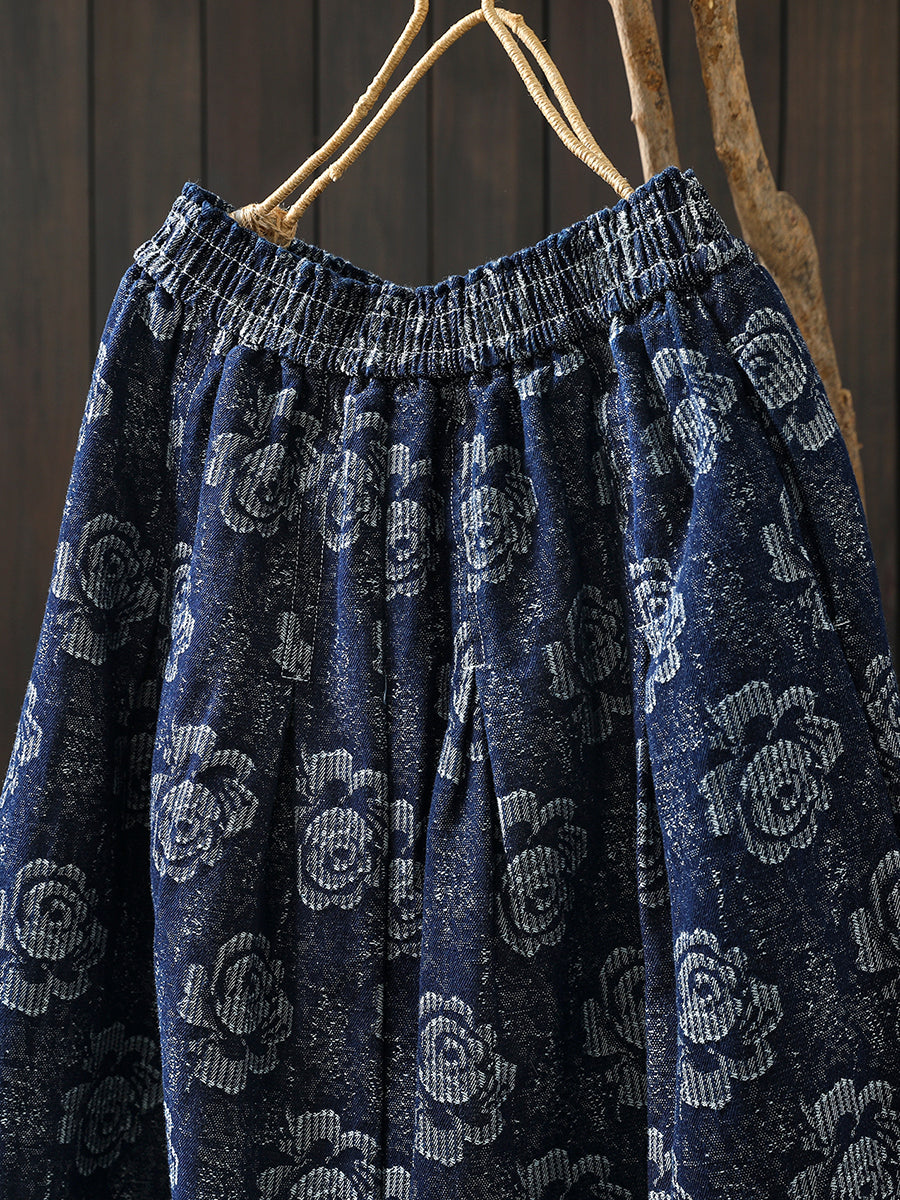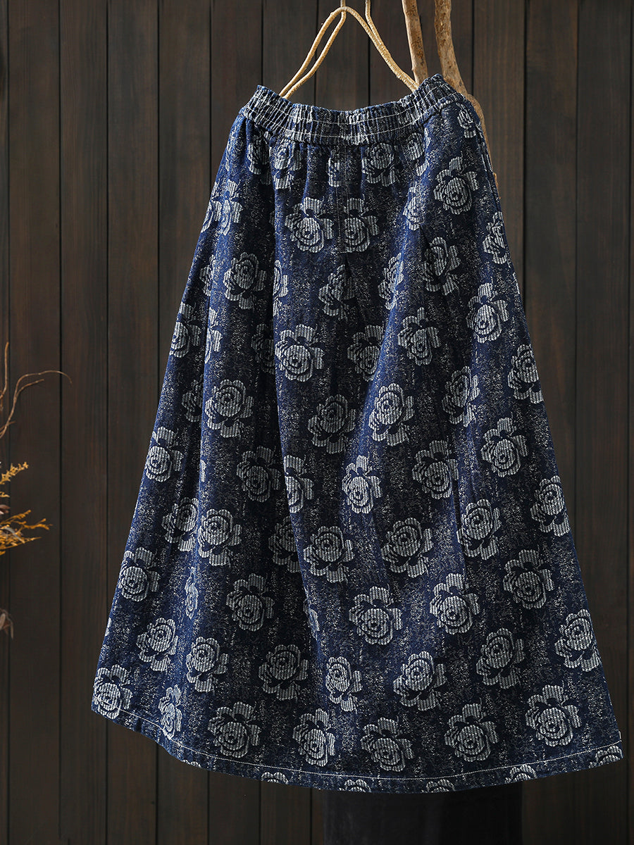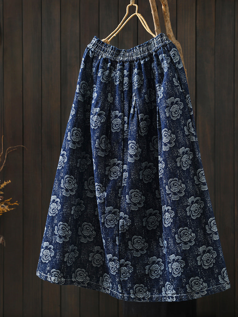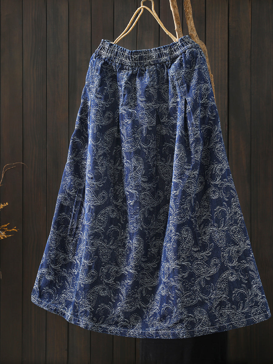 Women Winter Floral Embroidery 100%Cotton A-Shape Skirt