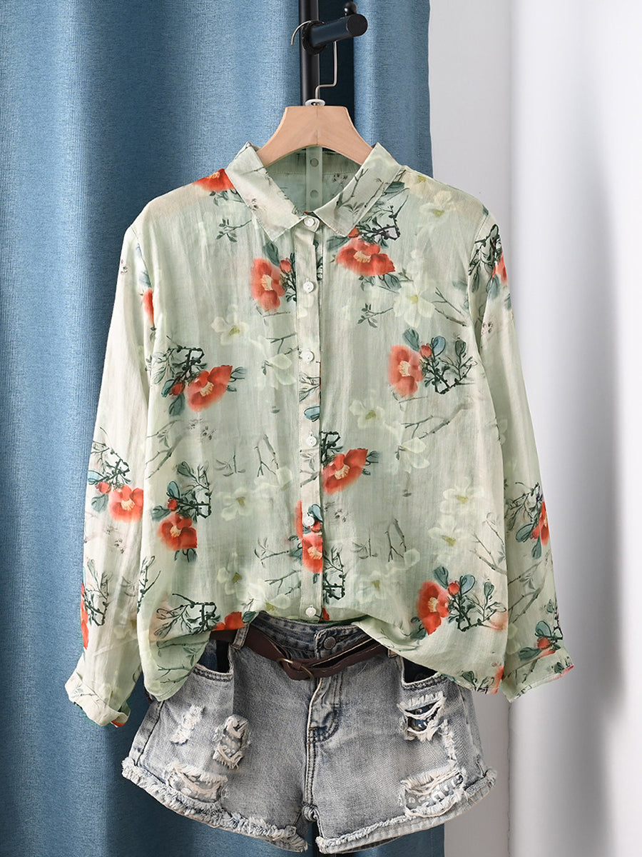Women Summer Artsy Flower Turn-down Collar 100%Ramie Shirt