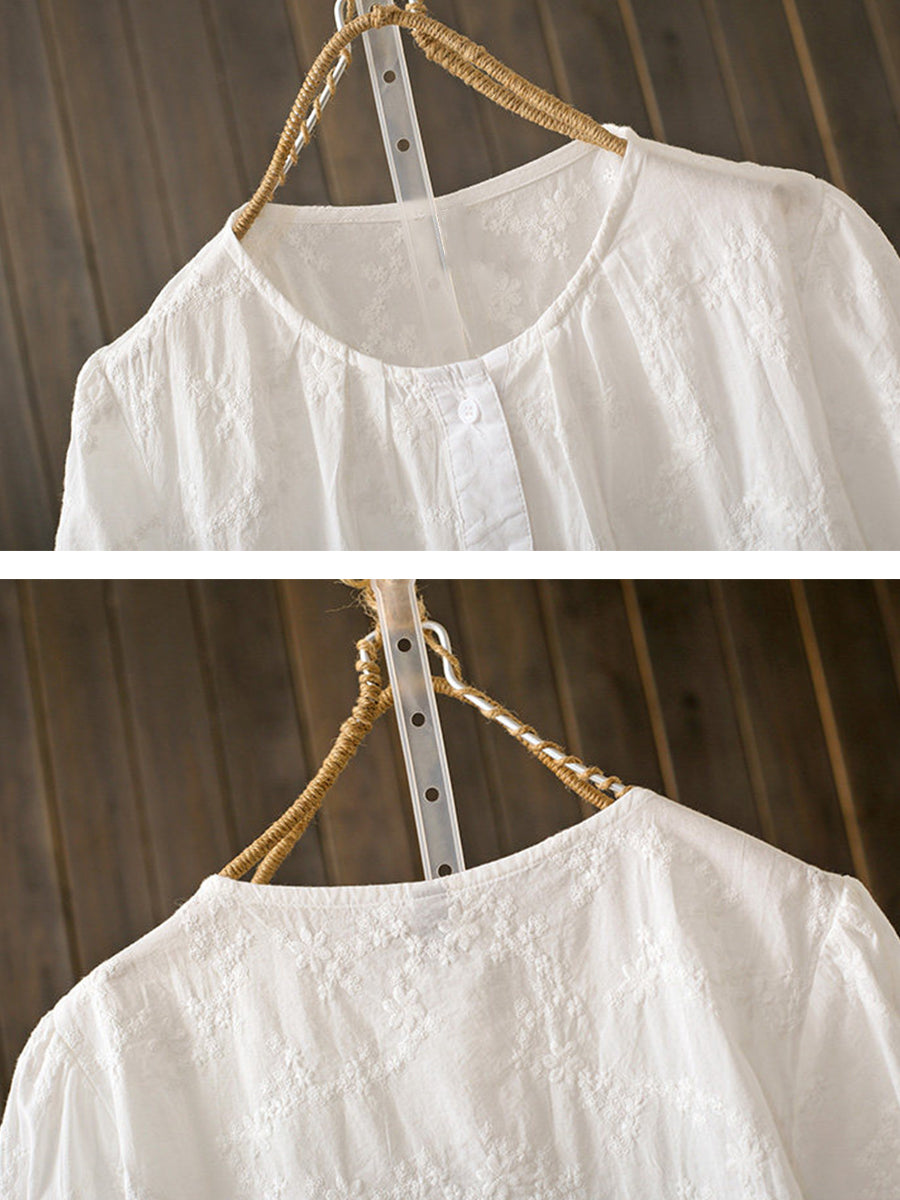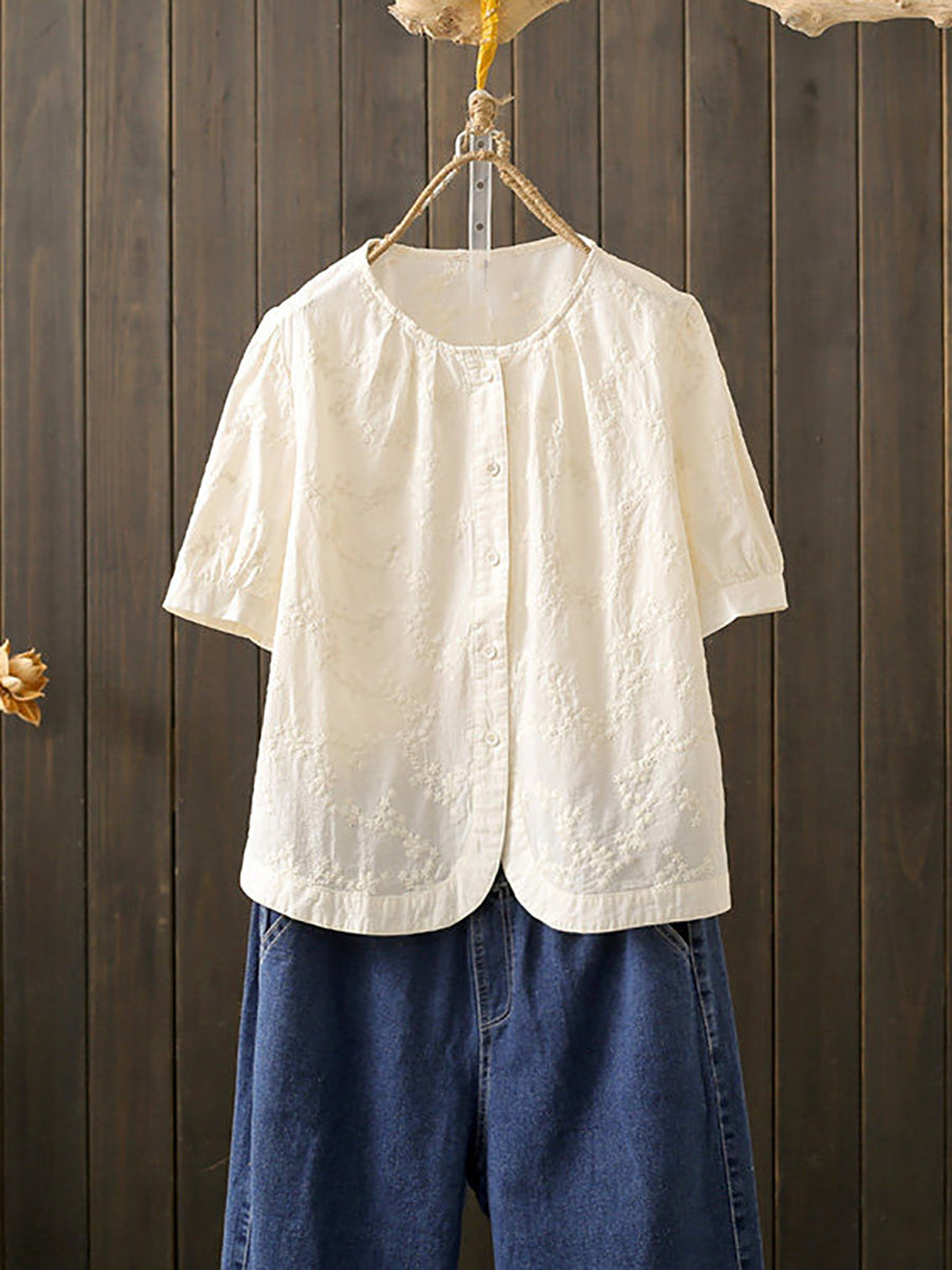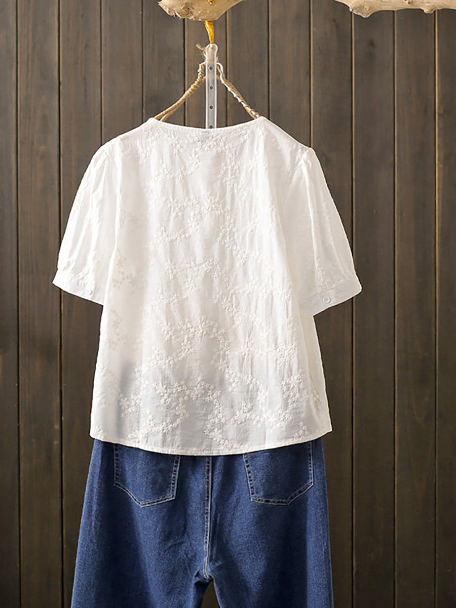 Women Summer Artsy Embroidery 100%Cotton O-Neck Blouse