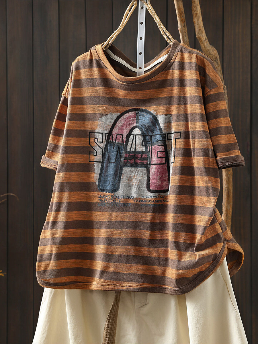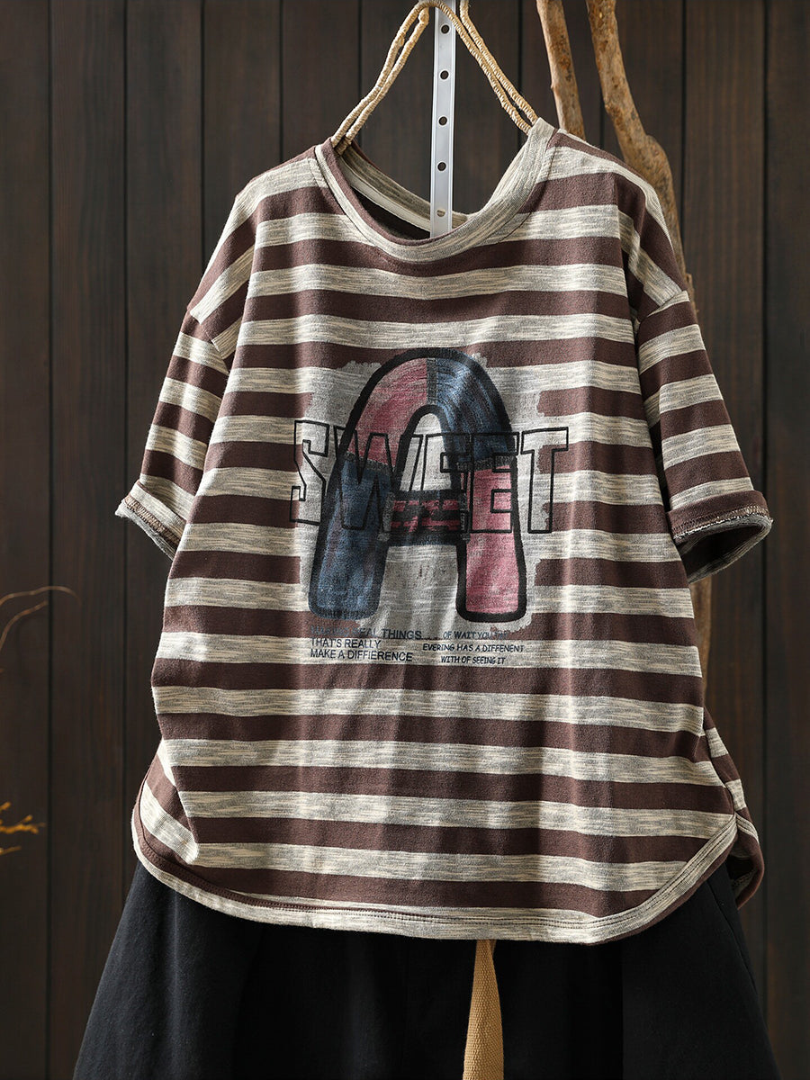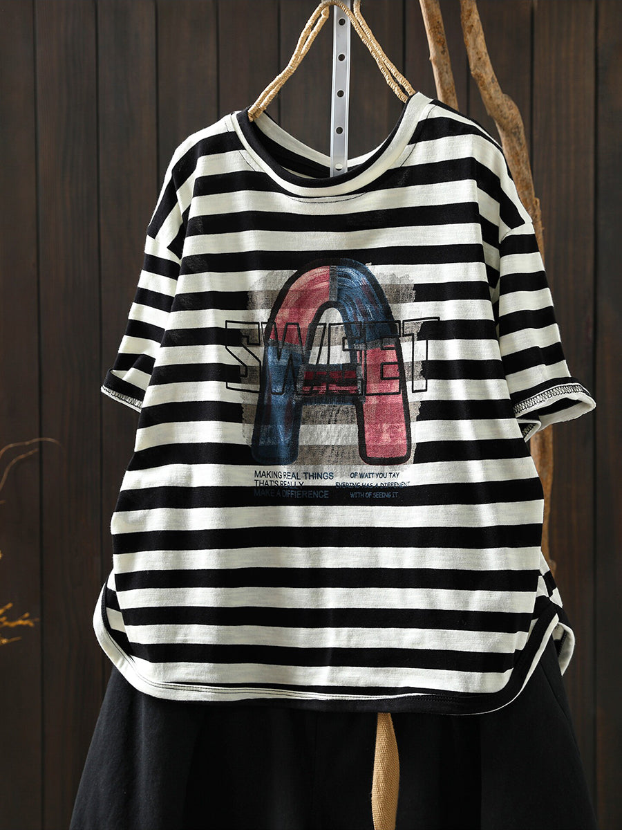 Women Summer Casual Stripe Letters Cotton T-Shirt
