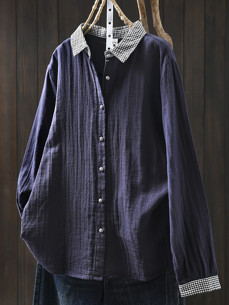 Women Autumn Pure Color Spliced O-Neck 100%Cotton Shirt
