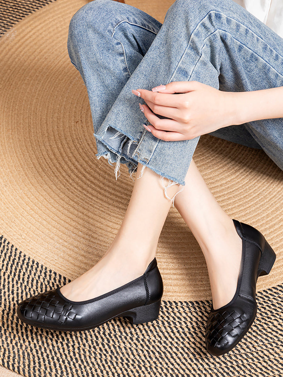 Women Summer Soft Leather Weave Mid Heel Shoes