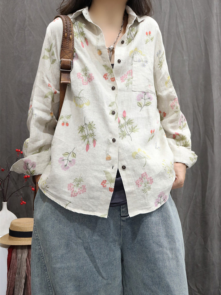 Women Autumn Flower 100%Linen Turn-down Collar Shirt