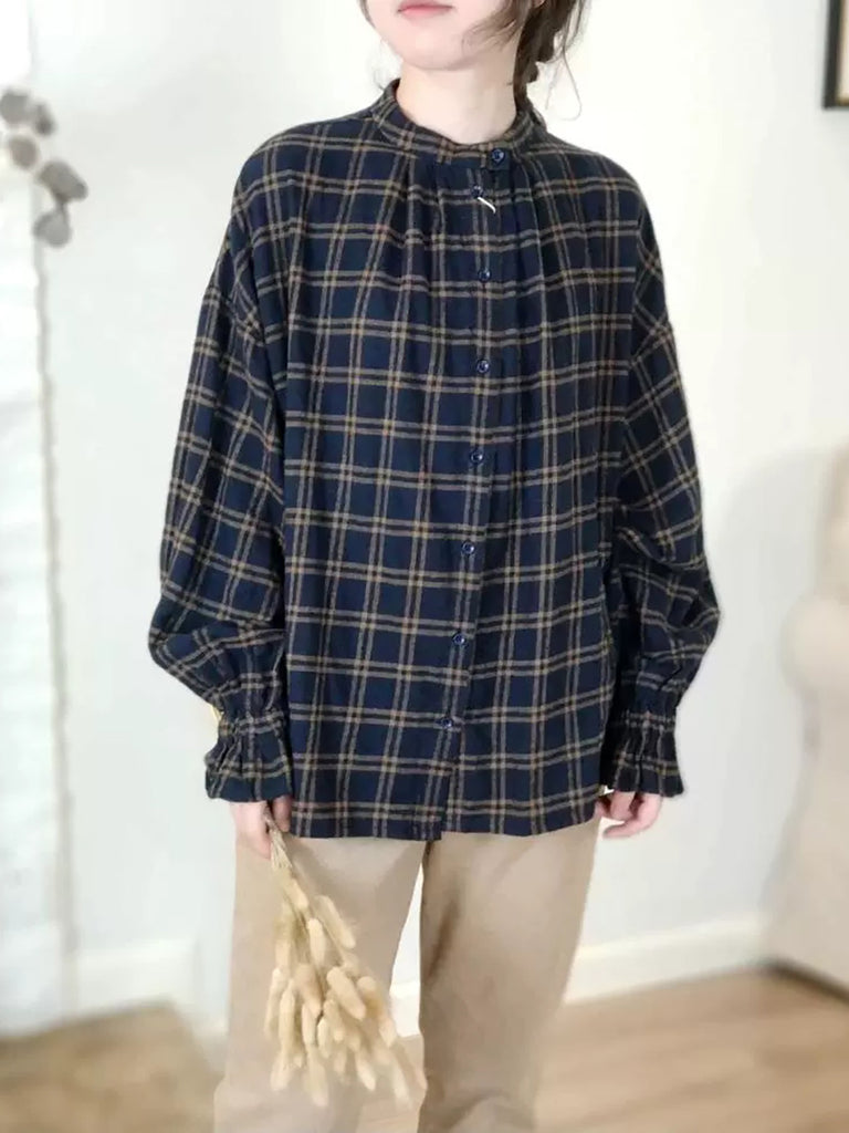 Women Autumn Artsy Plaid Stand Collar 100%Cotton Shirt