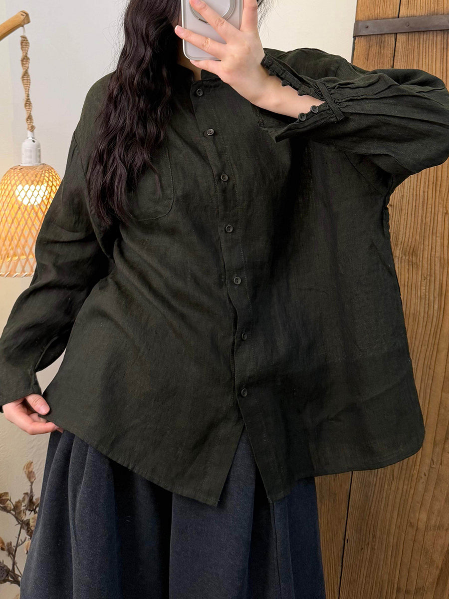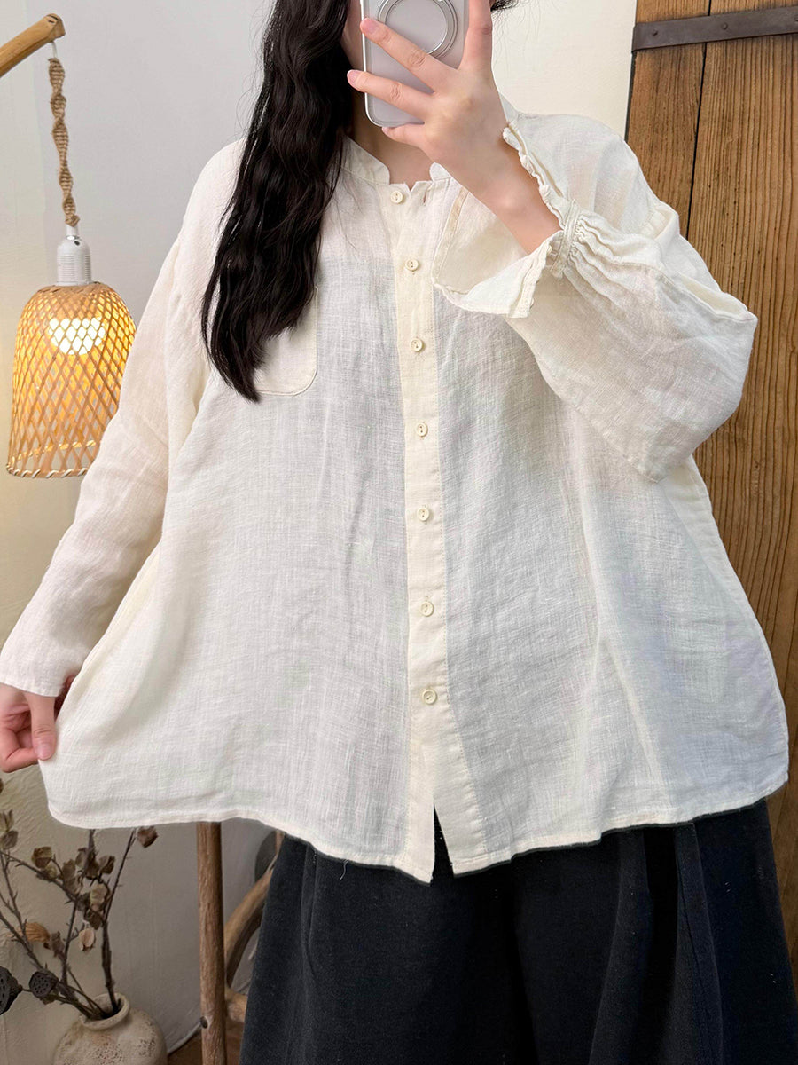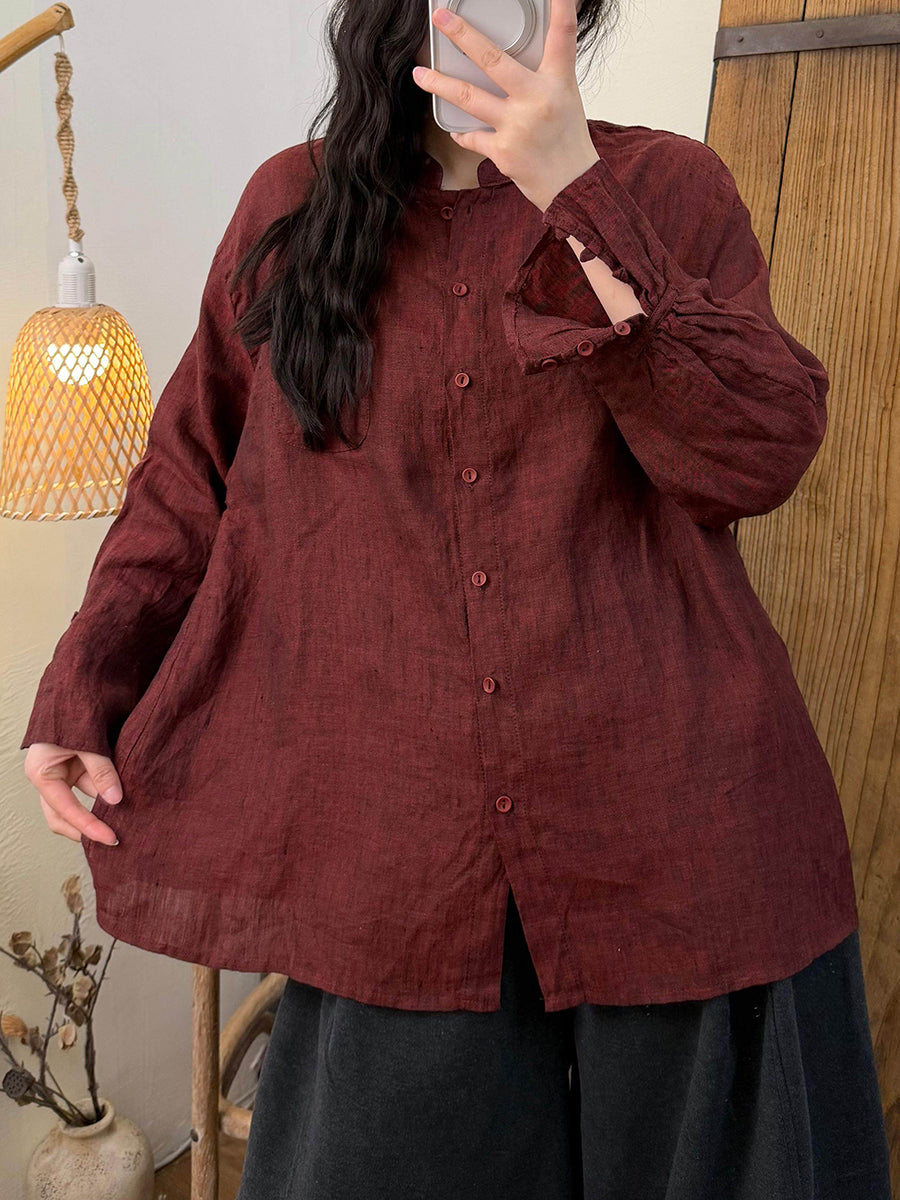 Women Spring Artsy Pure Color Linen Stand Collar Shirt