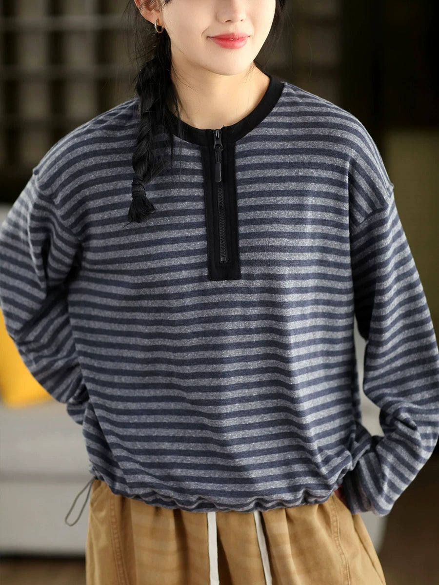 Women Artsy Spring Stripe O-Neck Cotton Blouse